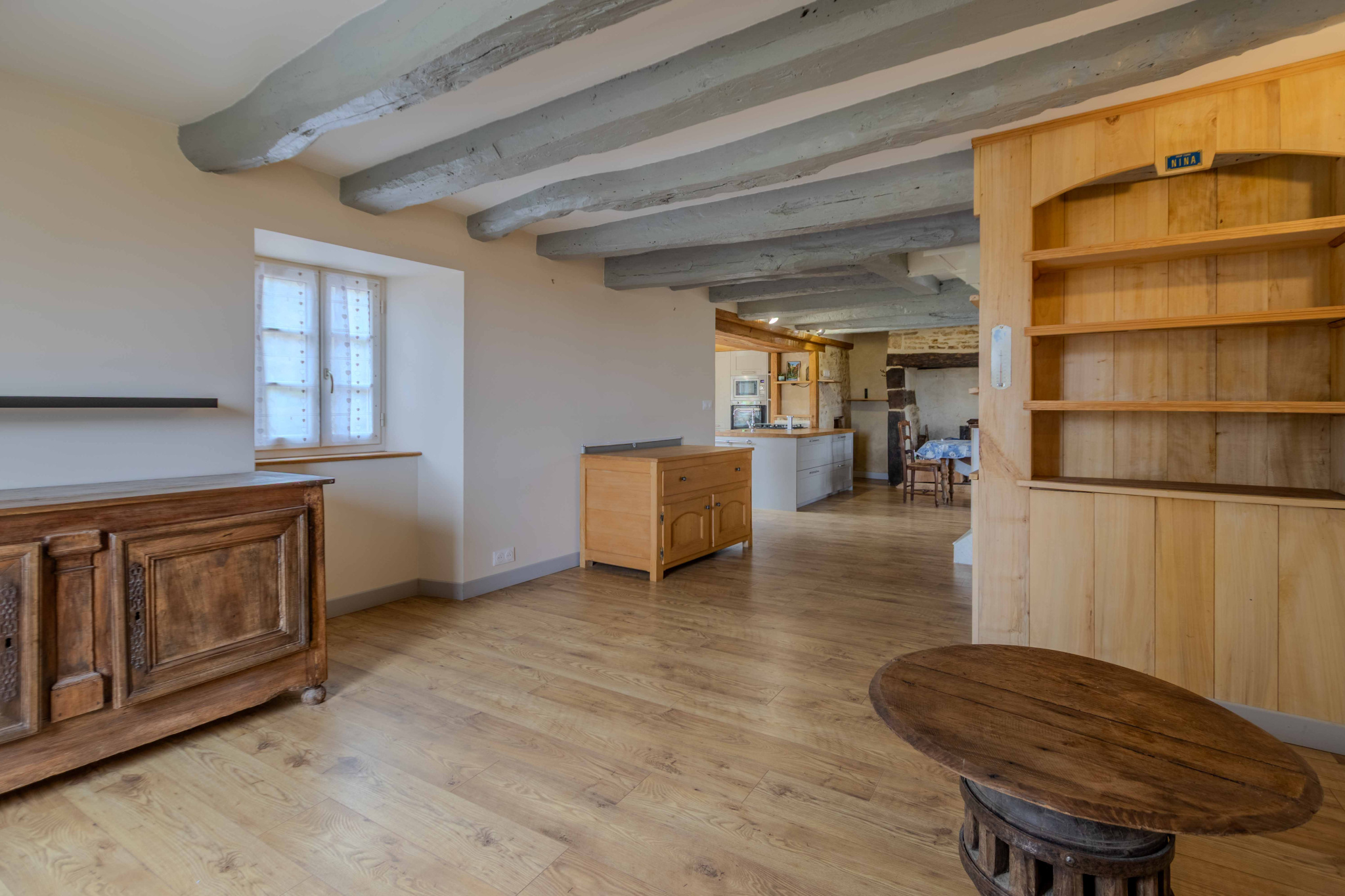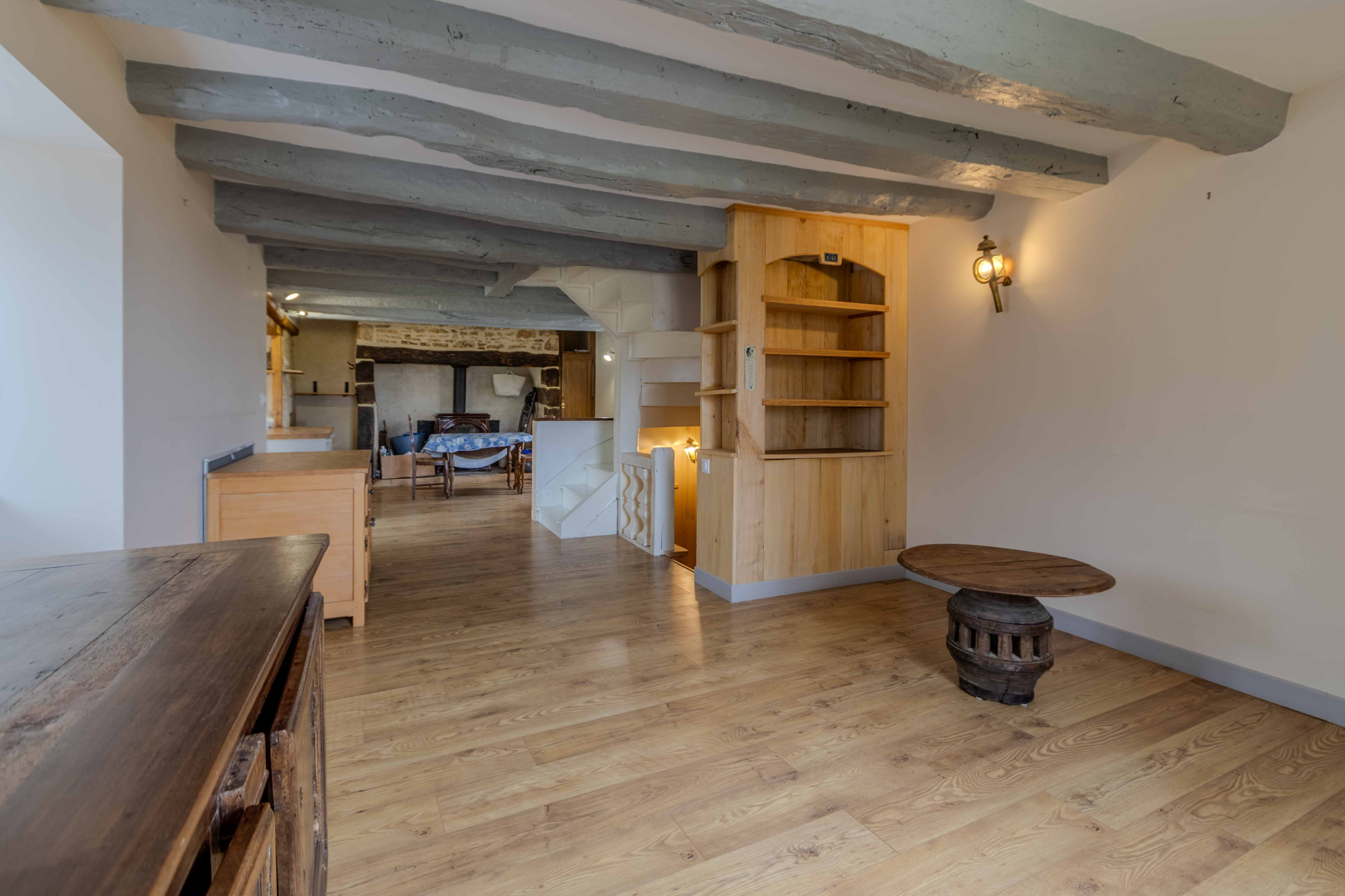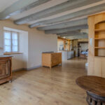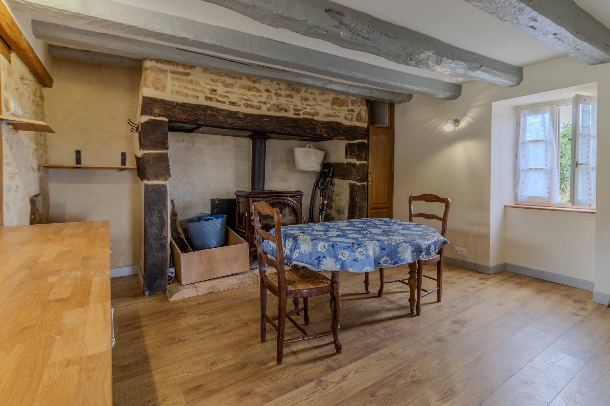 -Séjour-salon avec cheminée ouverte avec poêle à bois et poutraison.