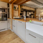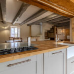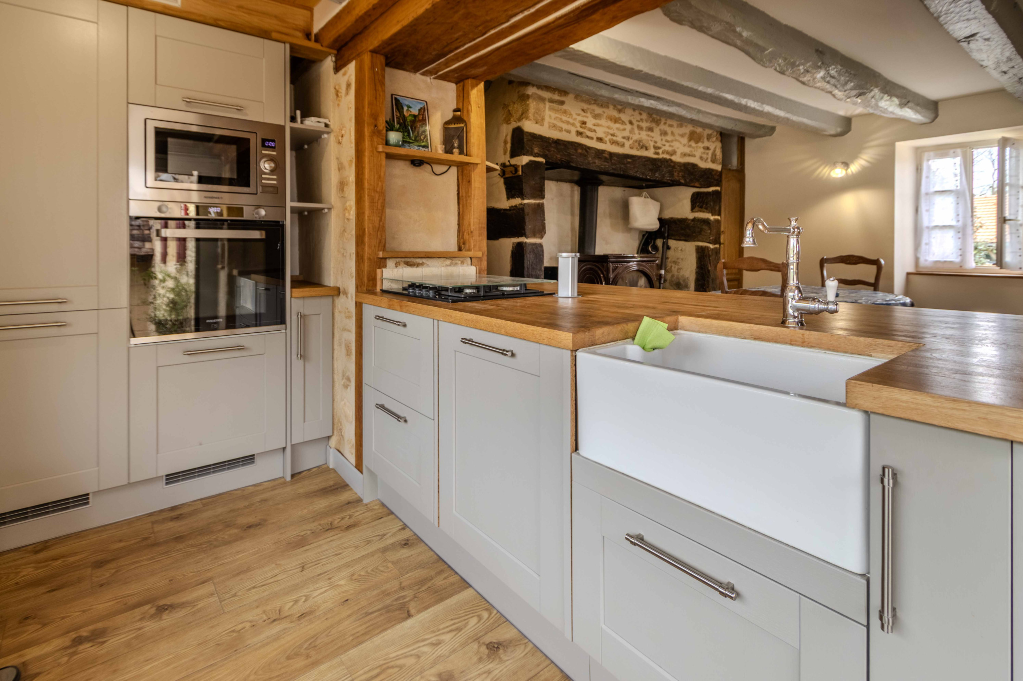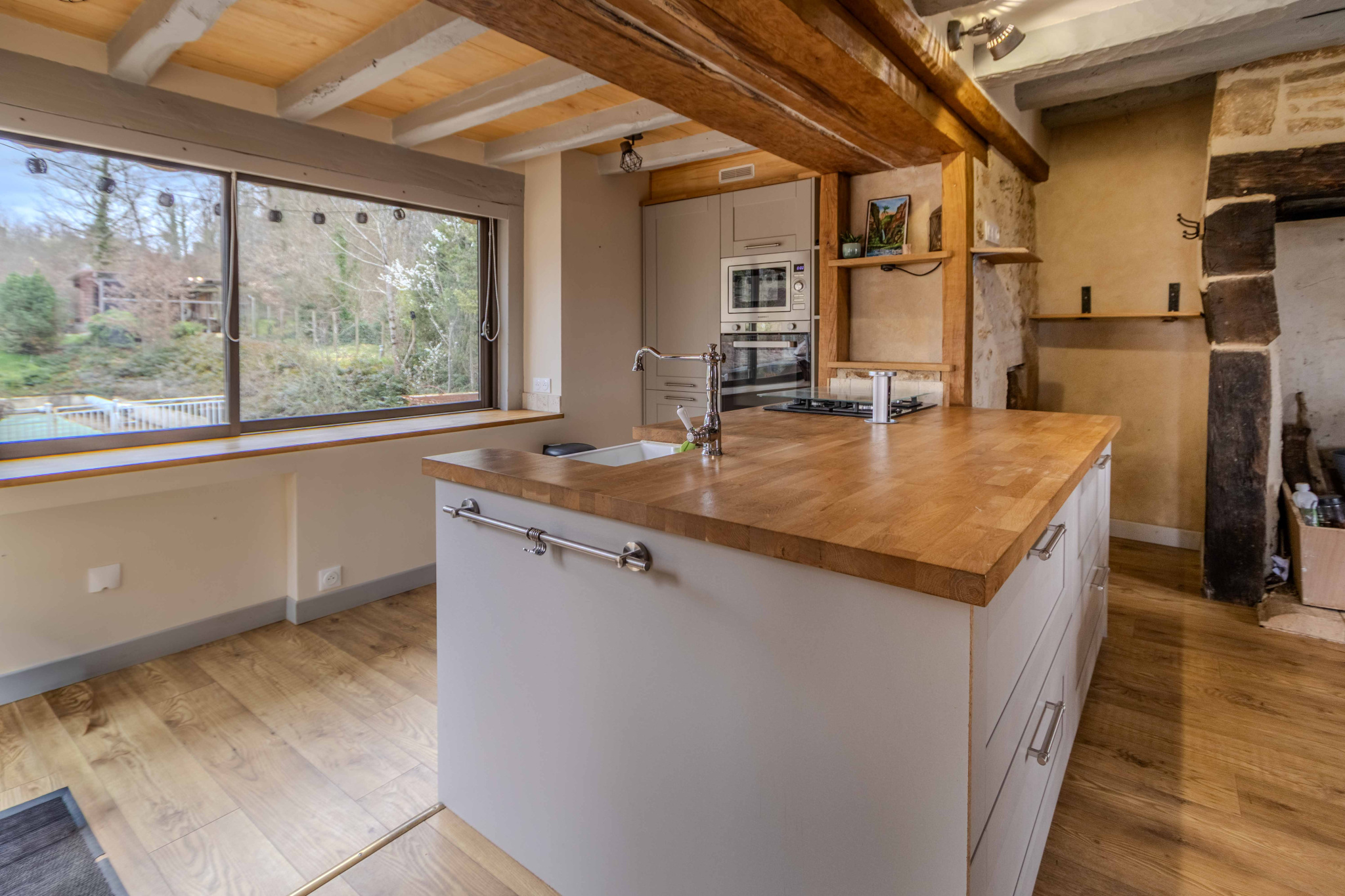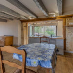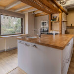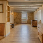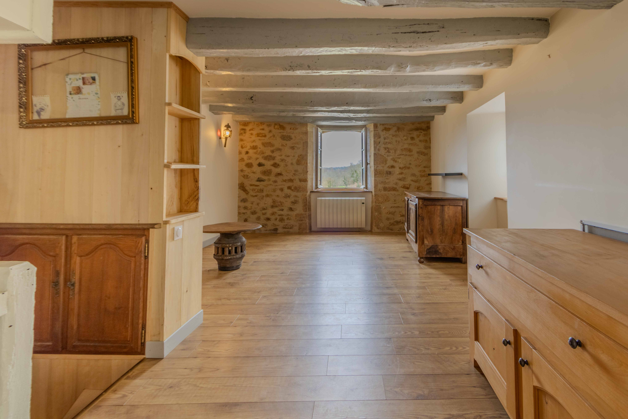 -Séjour-salon avec cheminée ouverte avec poêle à bois et poutraison.