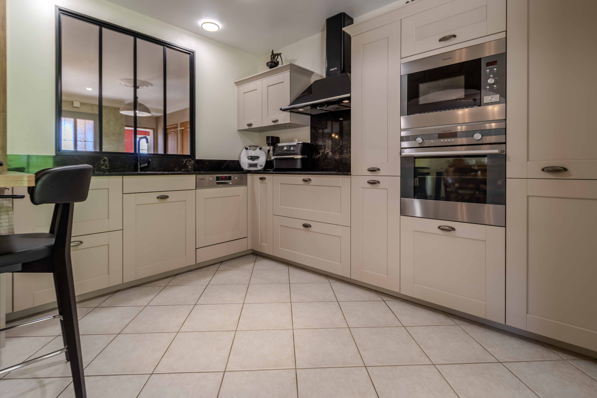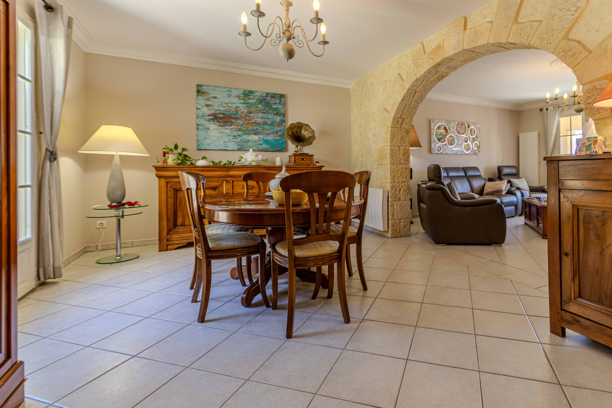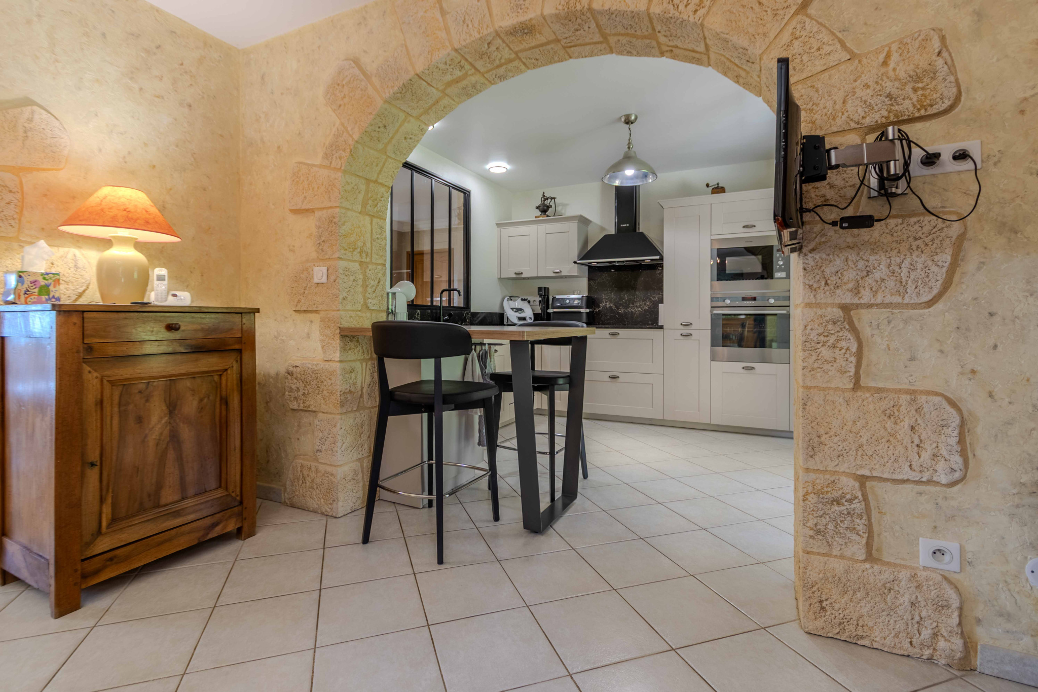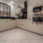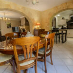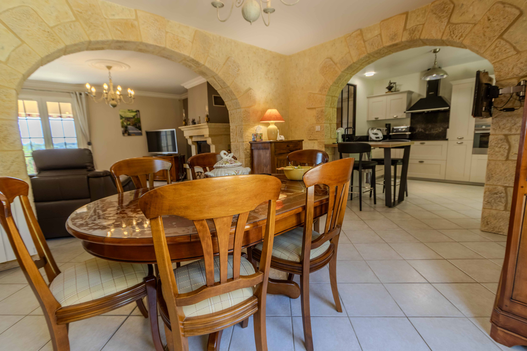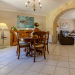 -salle à manger communiquant avec cuisine équipée et aménagée, prolongées par terrasse couverte.