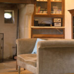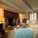-Salon avec cheminée ouverte en pierre, sol en pierre et poutraison.