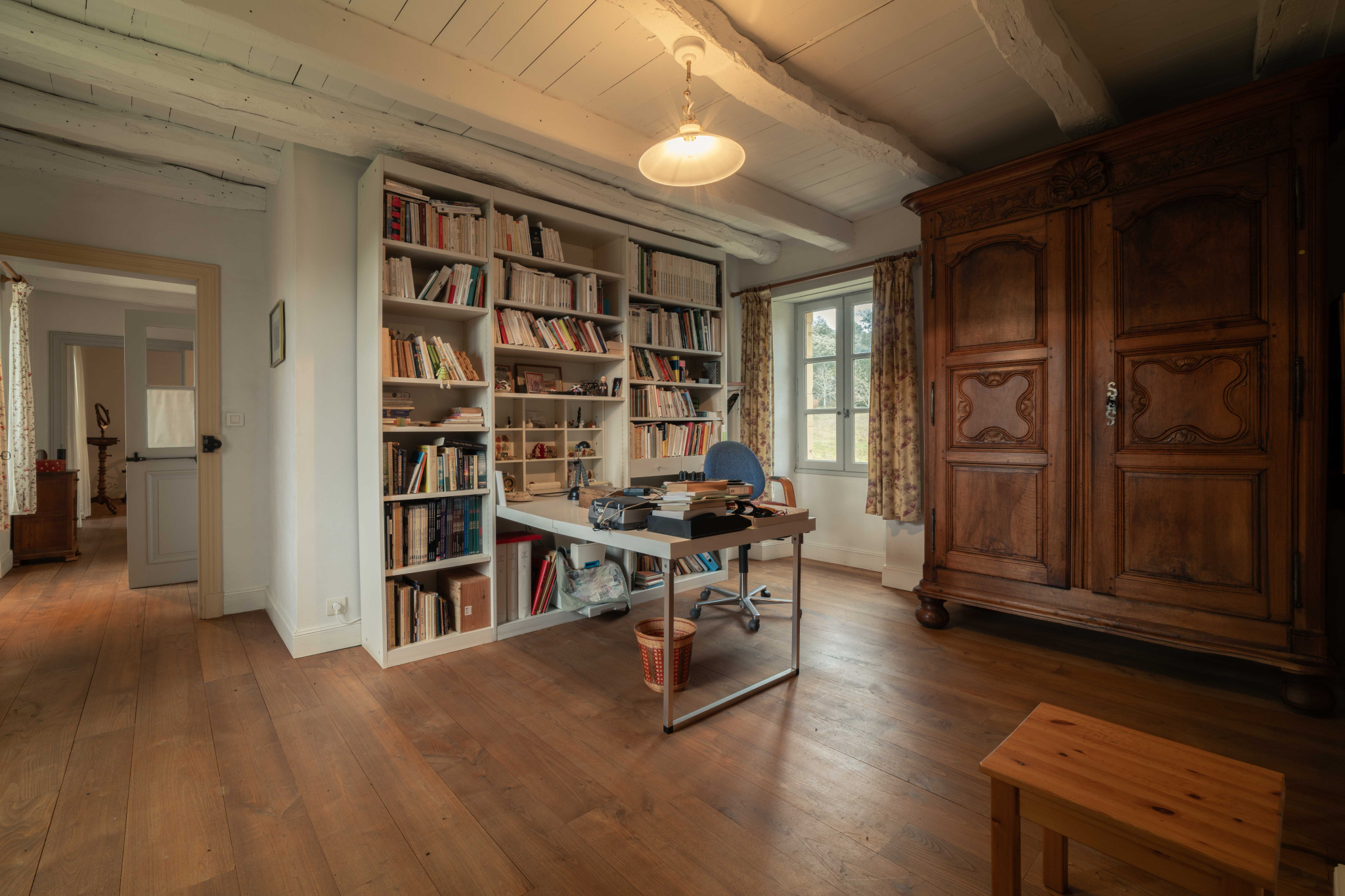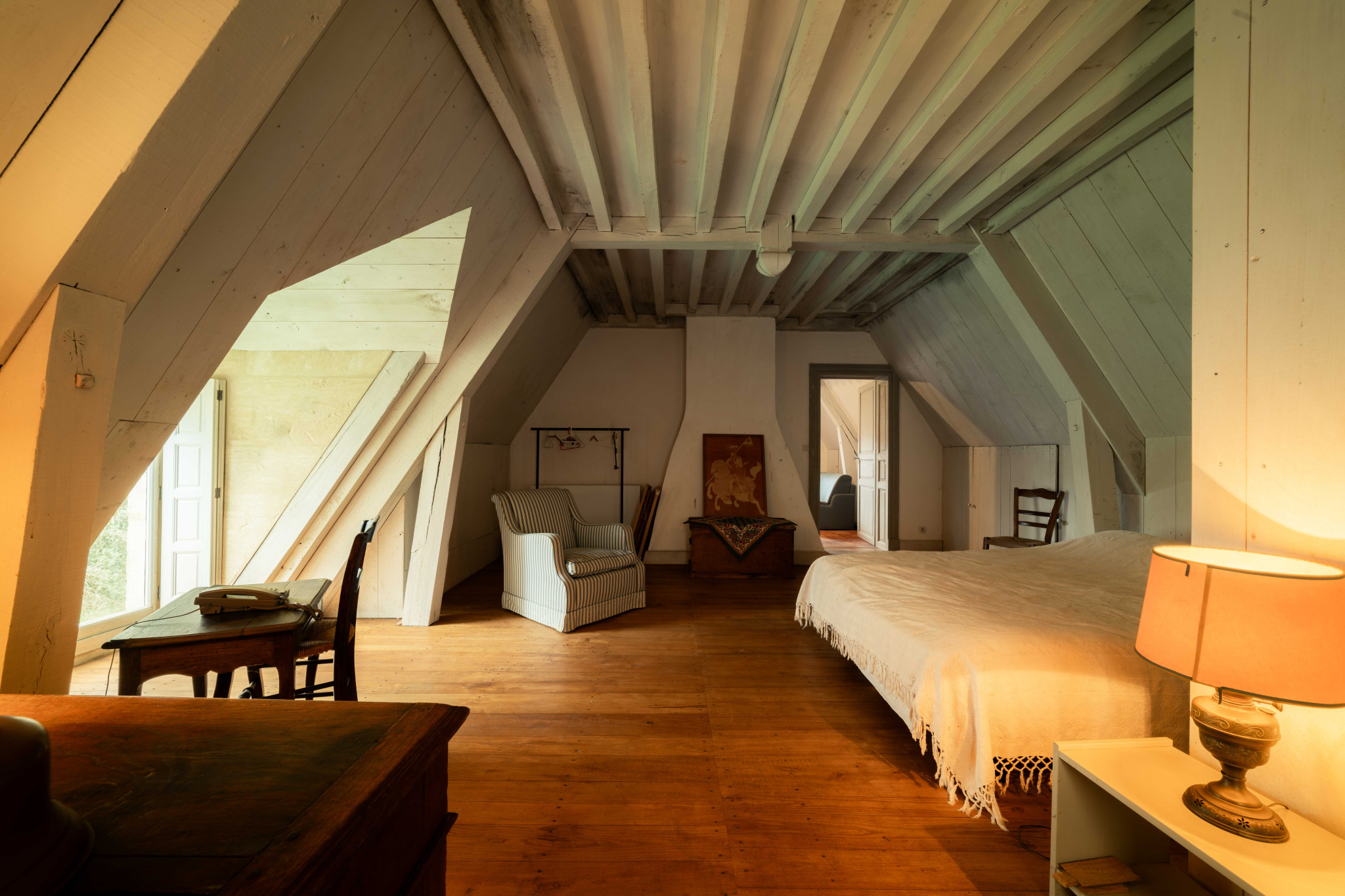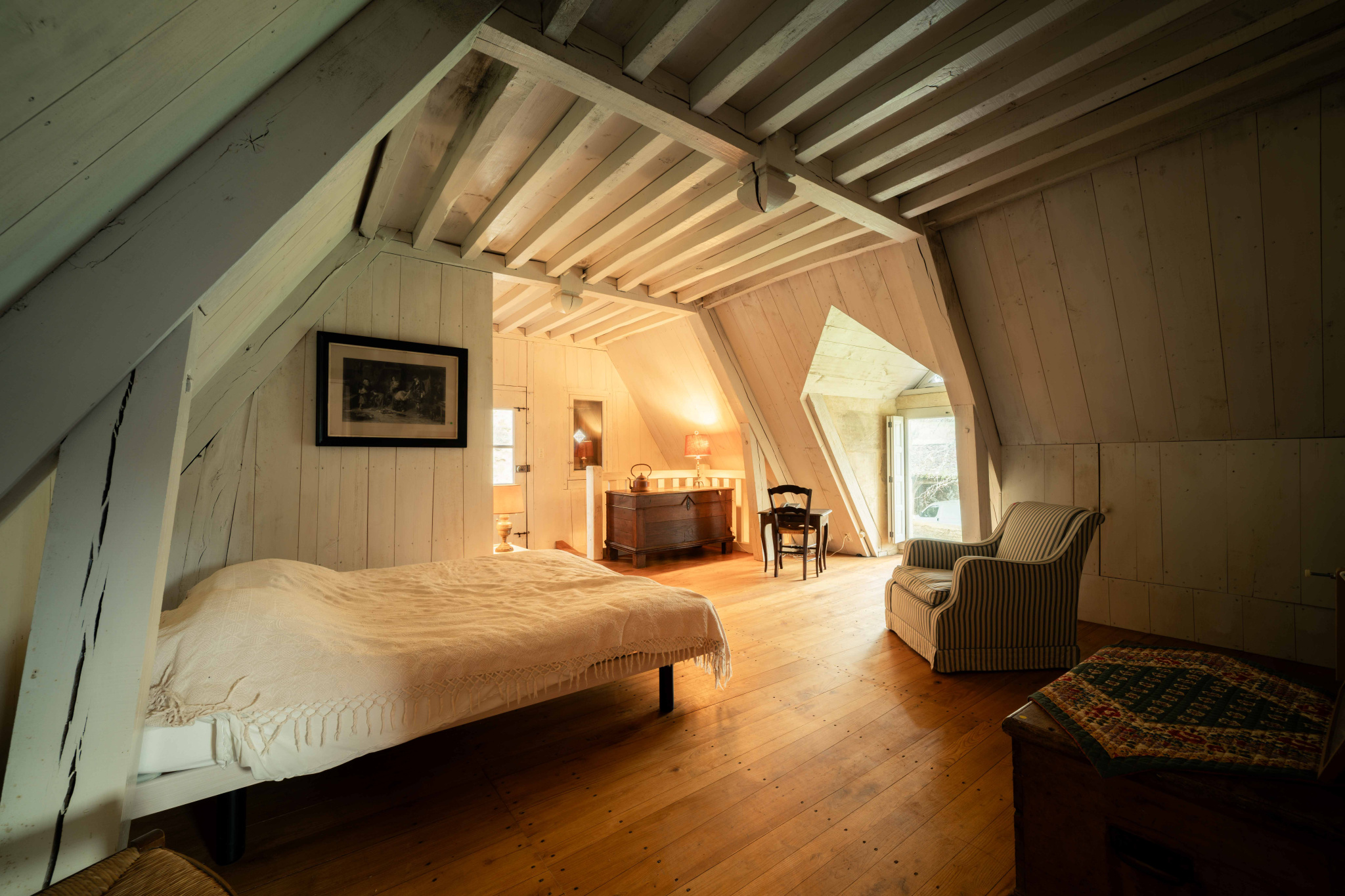 -Grande chambre parquet bois et poutraison, avec penderie sous rampants, traversante,