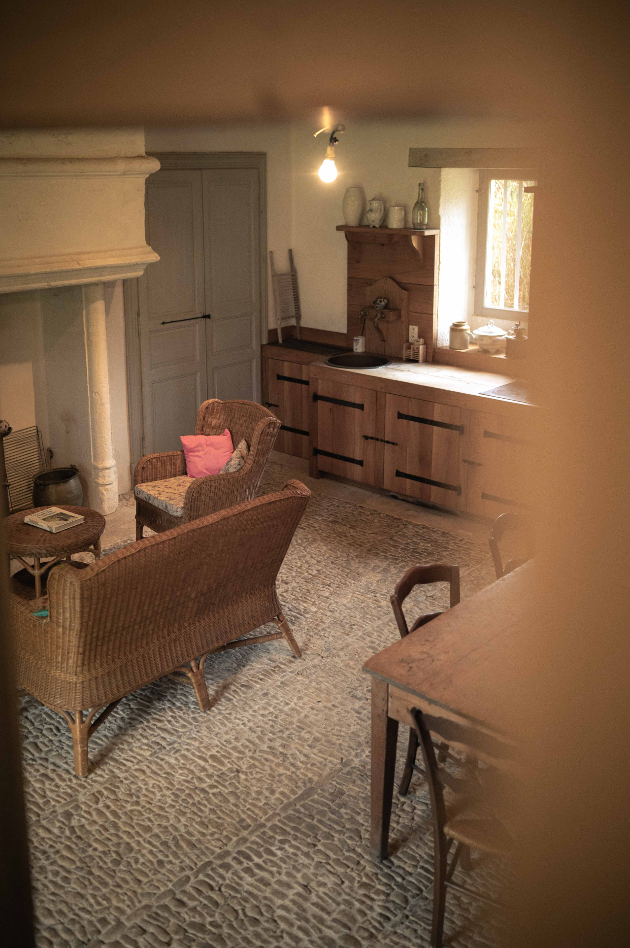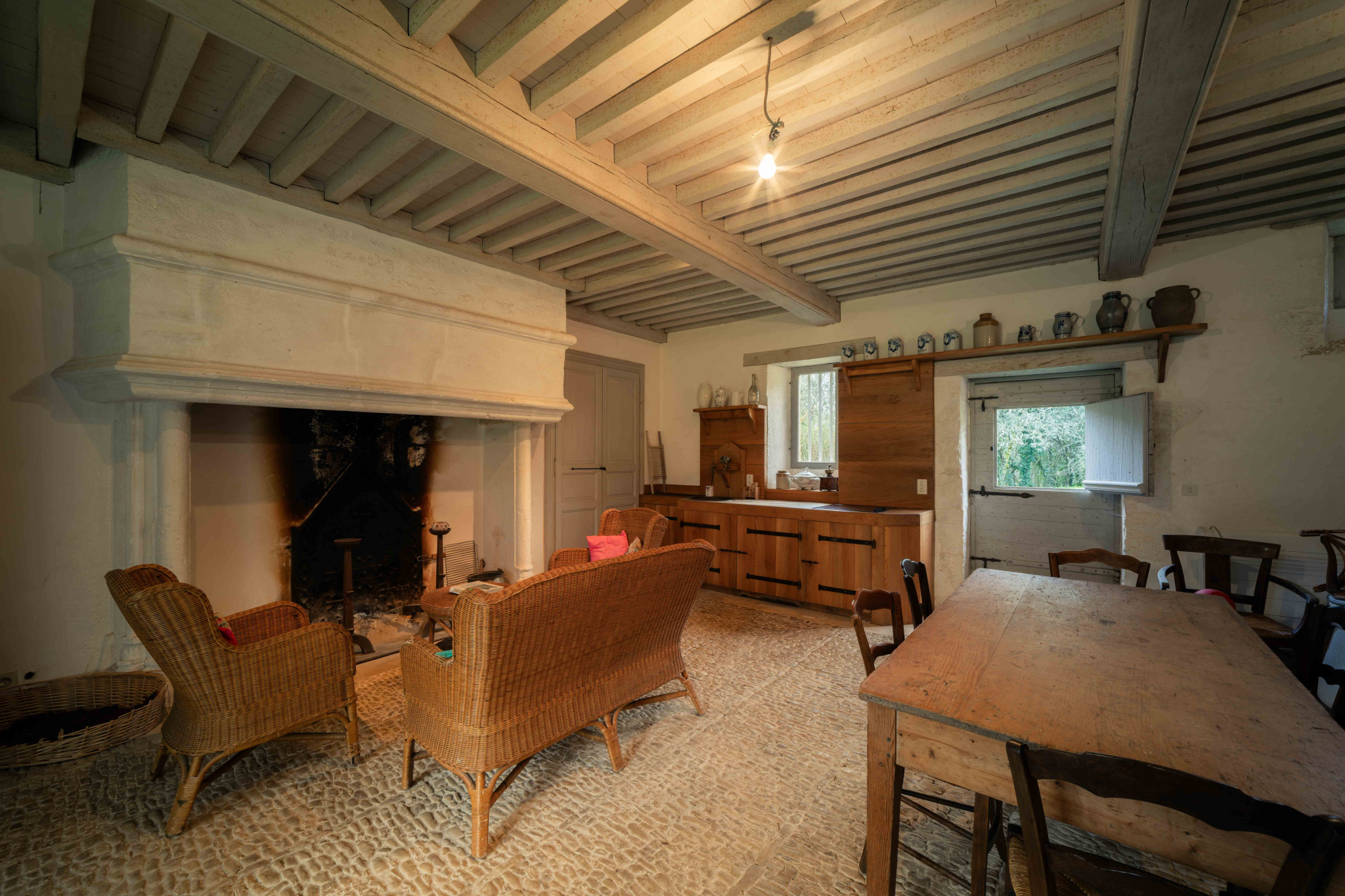 -Cuisine avec séjour, cheminée ouverte, sol en pisé et poutraison,
