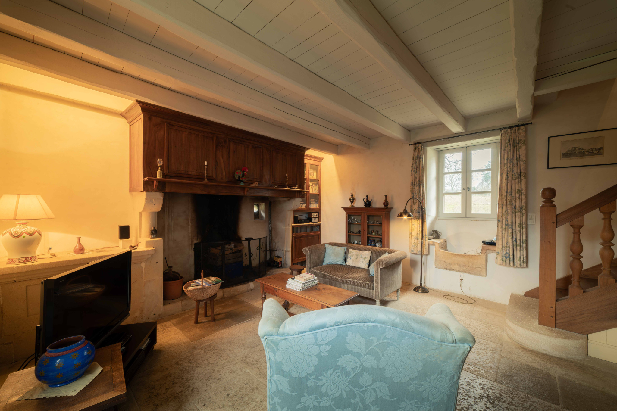 -Salon avec cheminée ouverte en pierre, sol en pierre et poutraison.