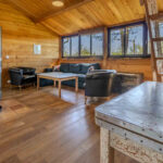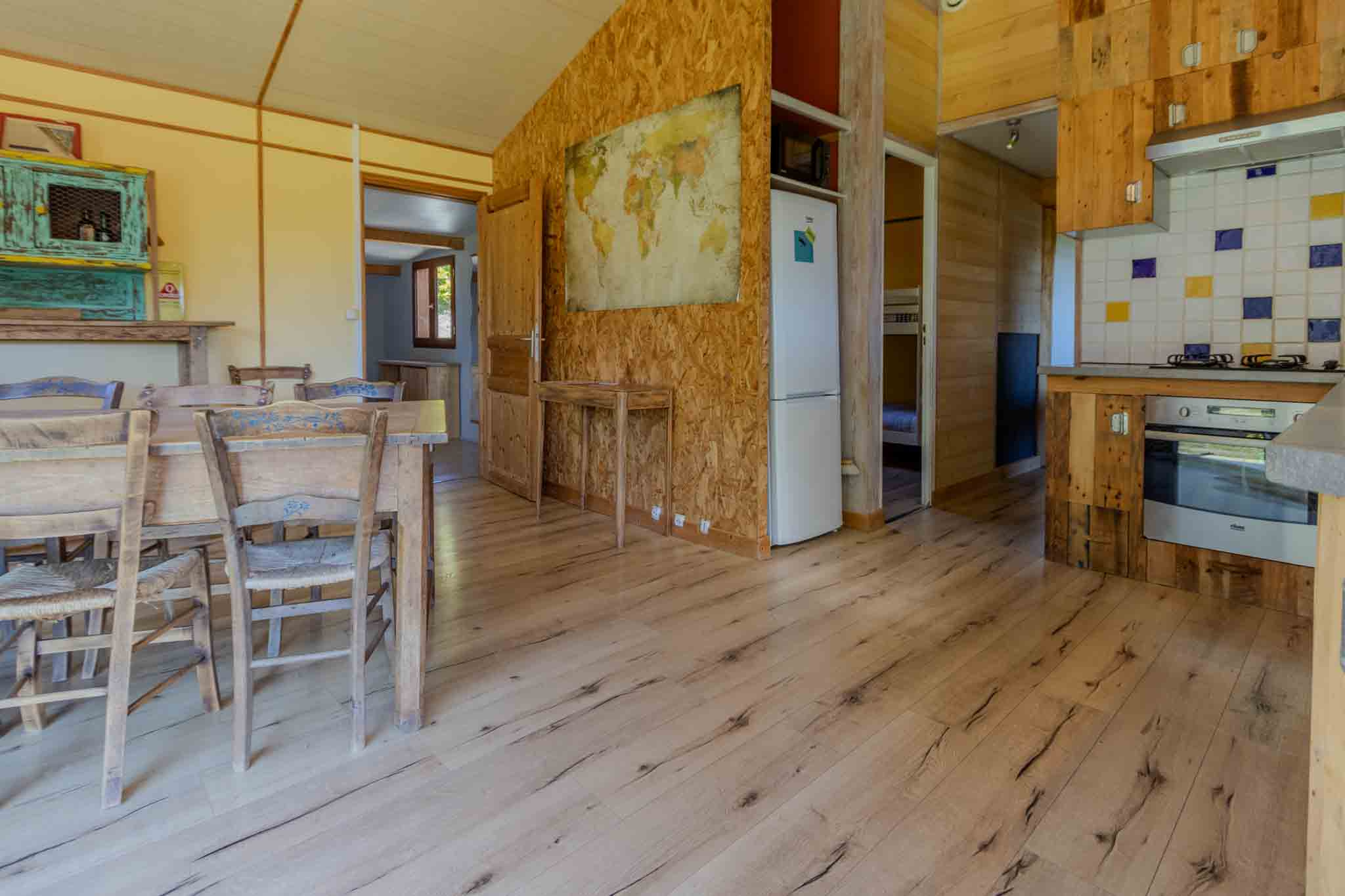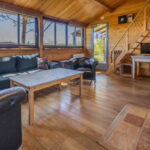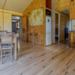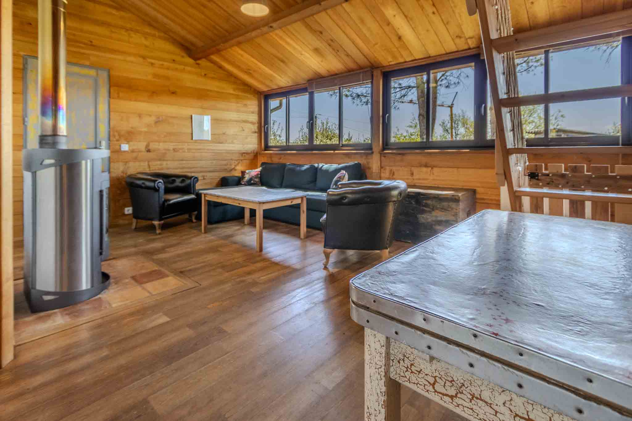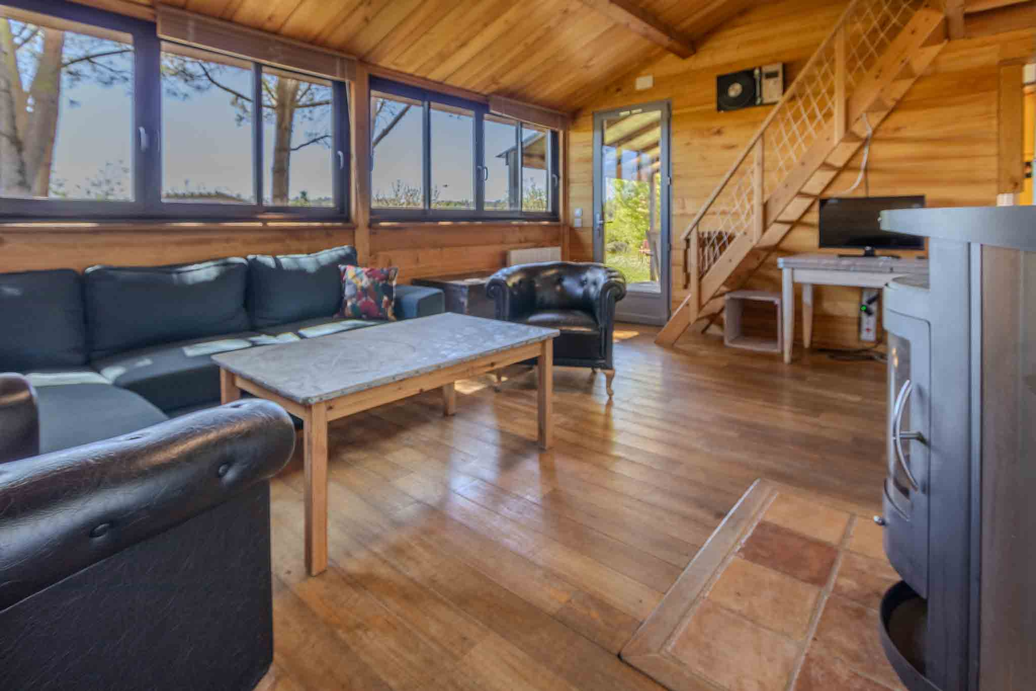 -Salon avec poêle à bois et parquet bois, avec petite mezzanine, ouvrant sur terrasse.