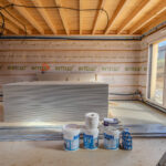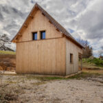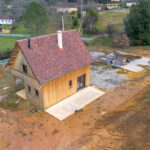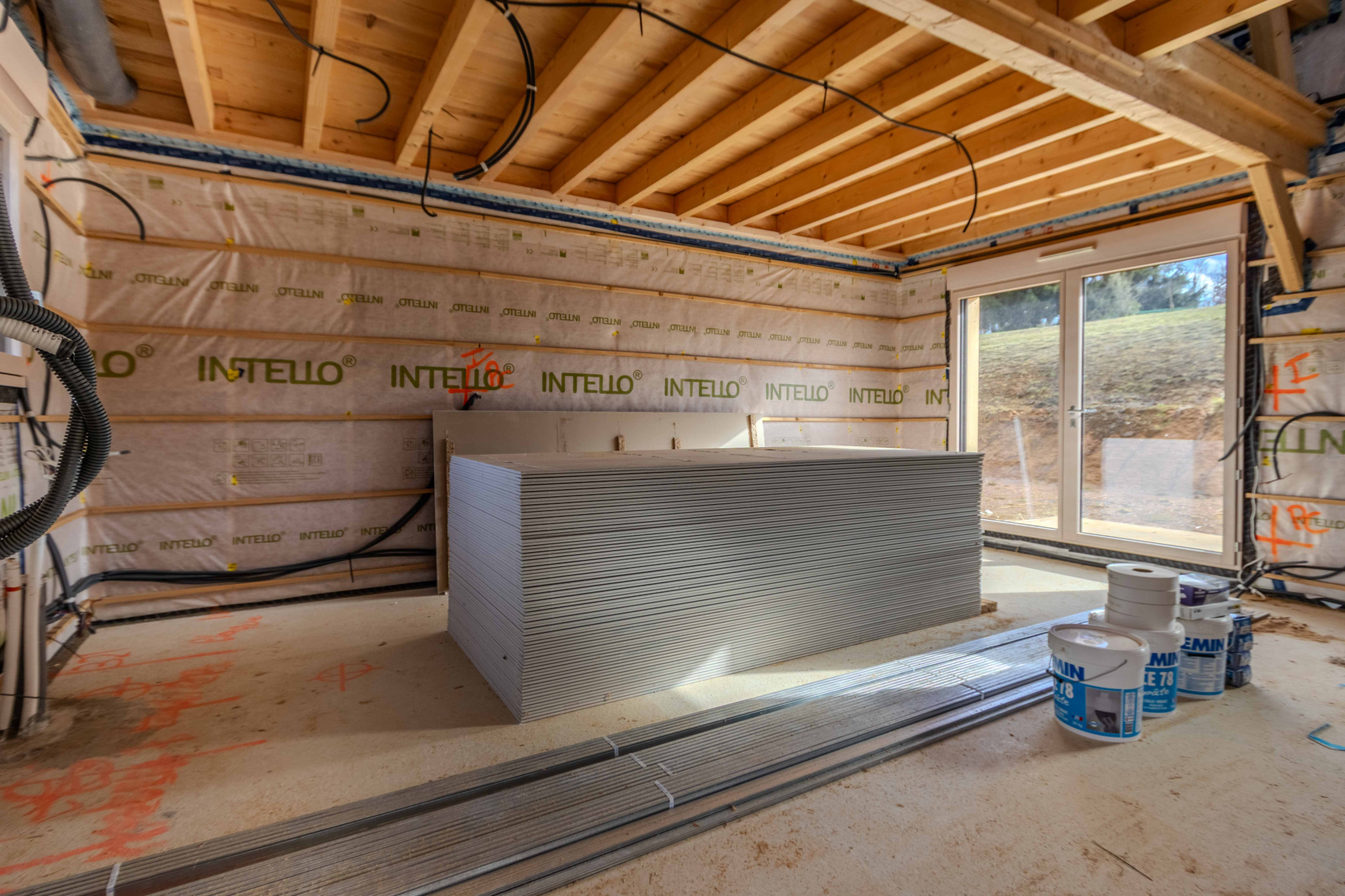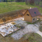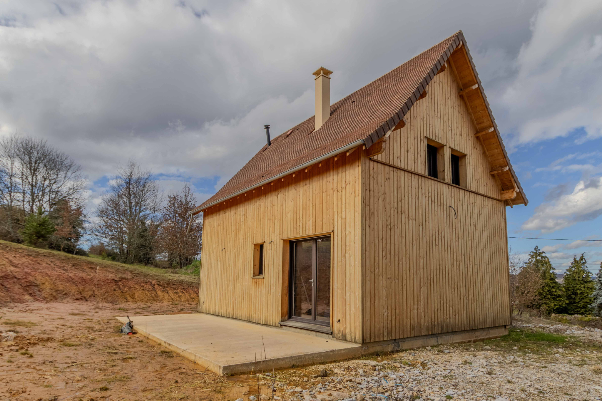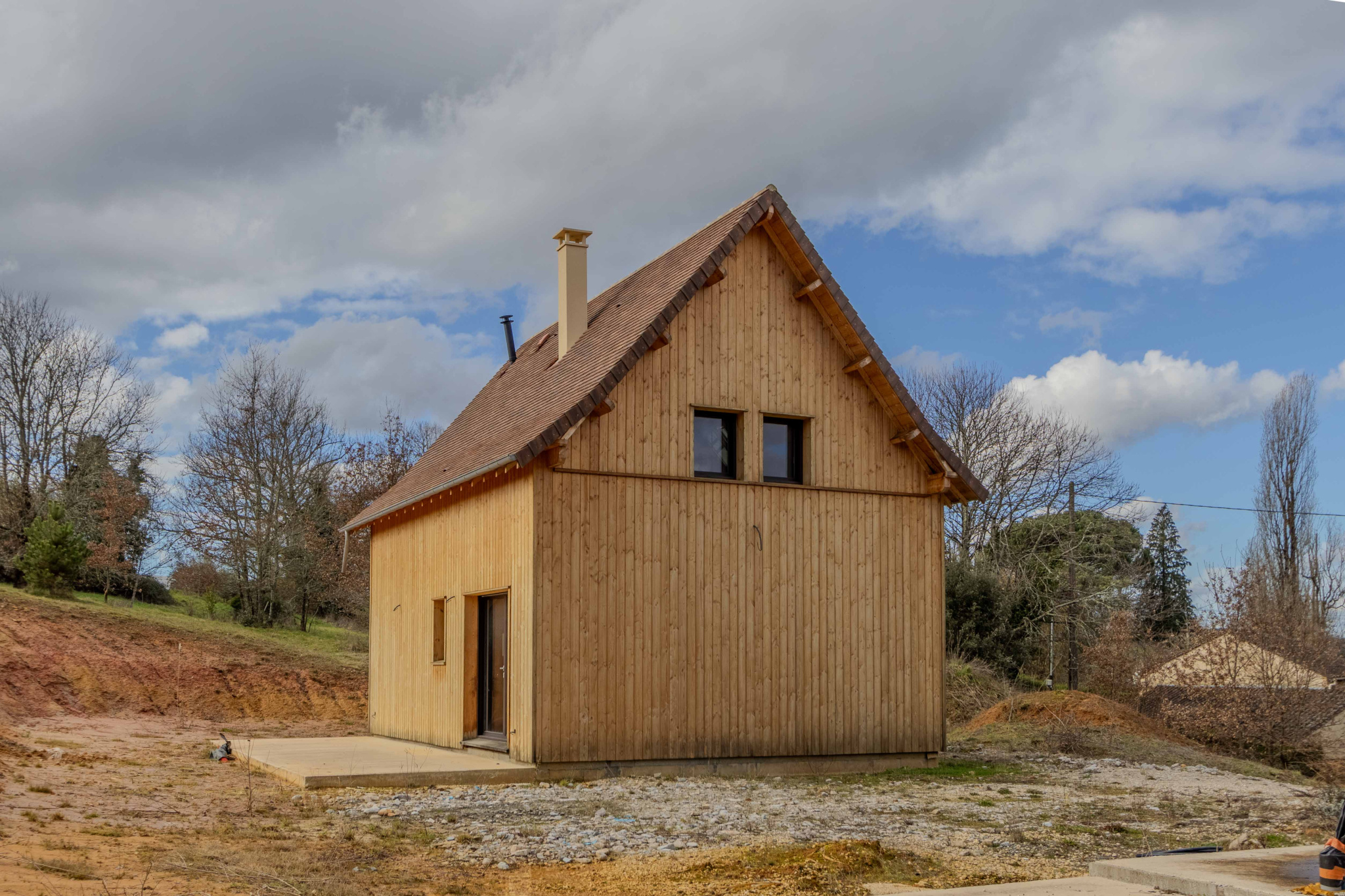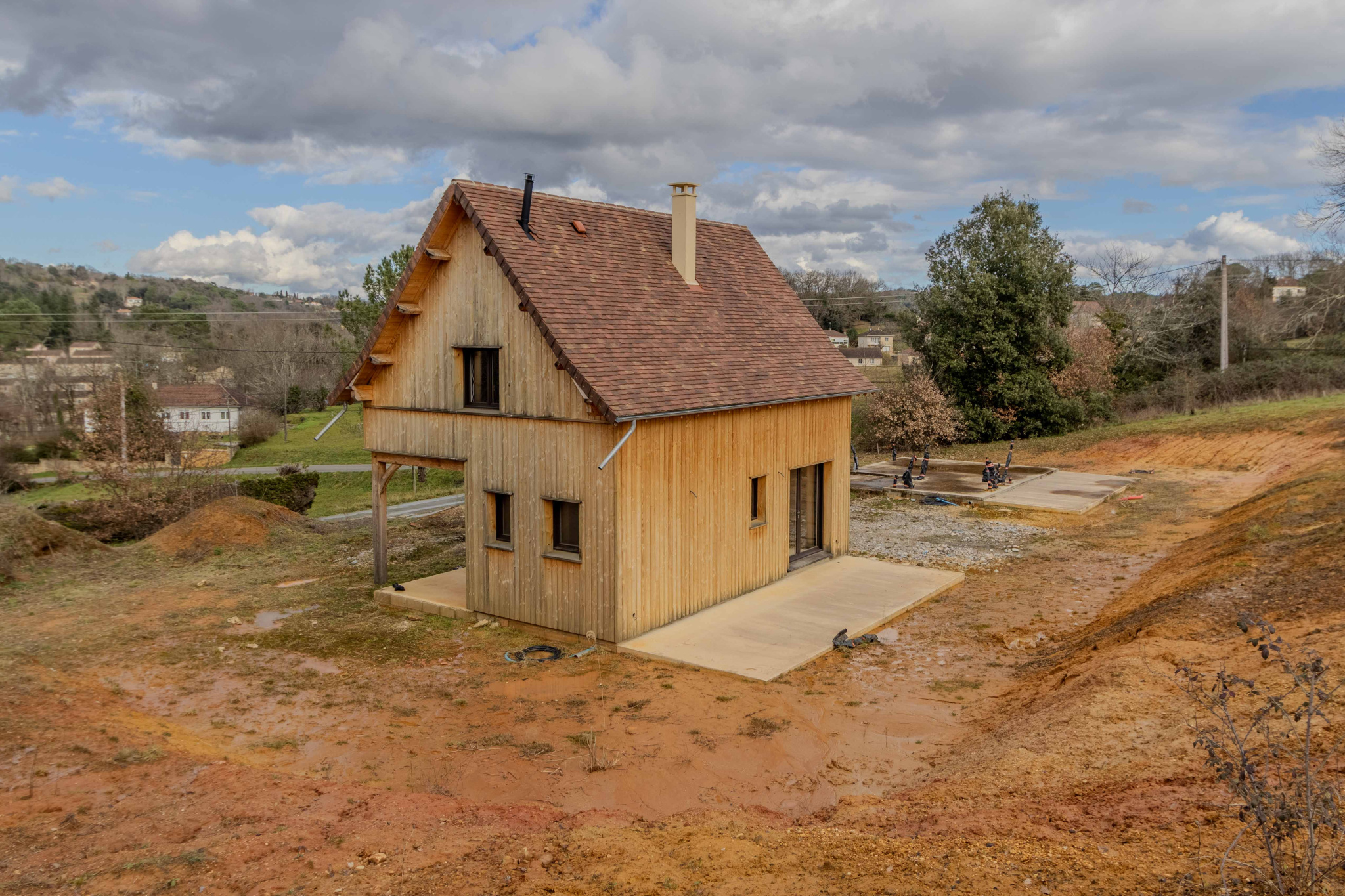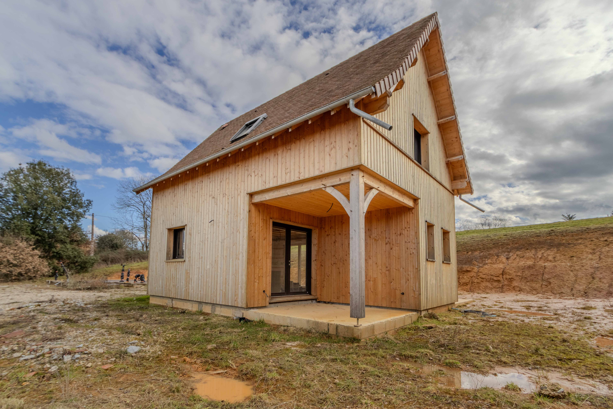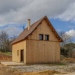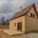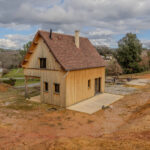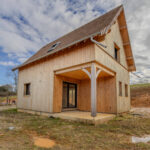 Maison ossature bois, hors d’eau et hors d’air, développant environ 50 m2 au sol, avec terrasse couverte aménageable. Le projet comprend un rez-de-jardin et un étage, implanté sur un terrain d’environ 2 900 m2.