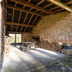 -Pièce de vie avec cheminée ouverte avec poêle à bois.