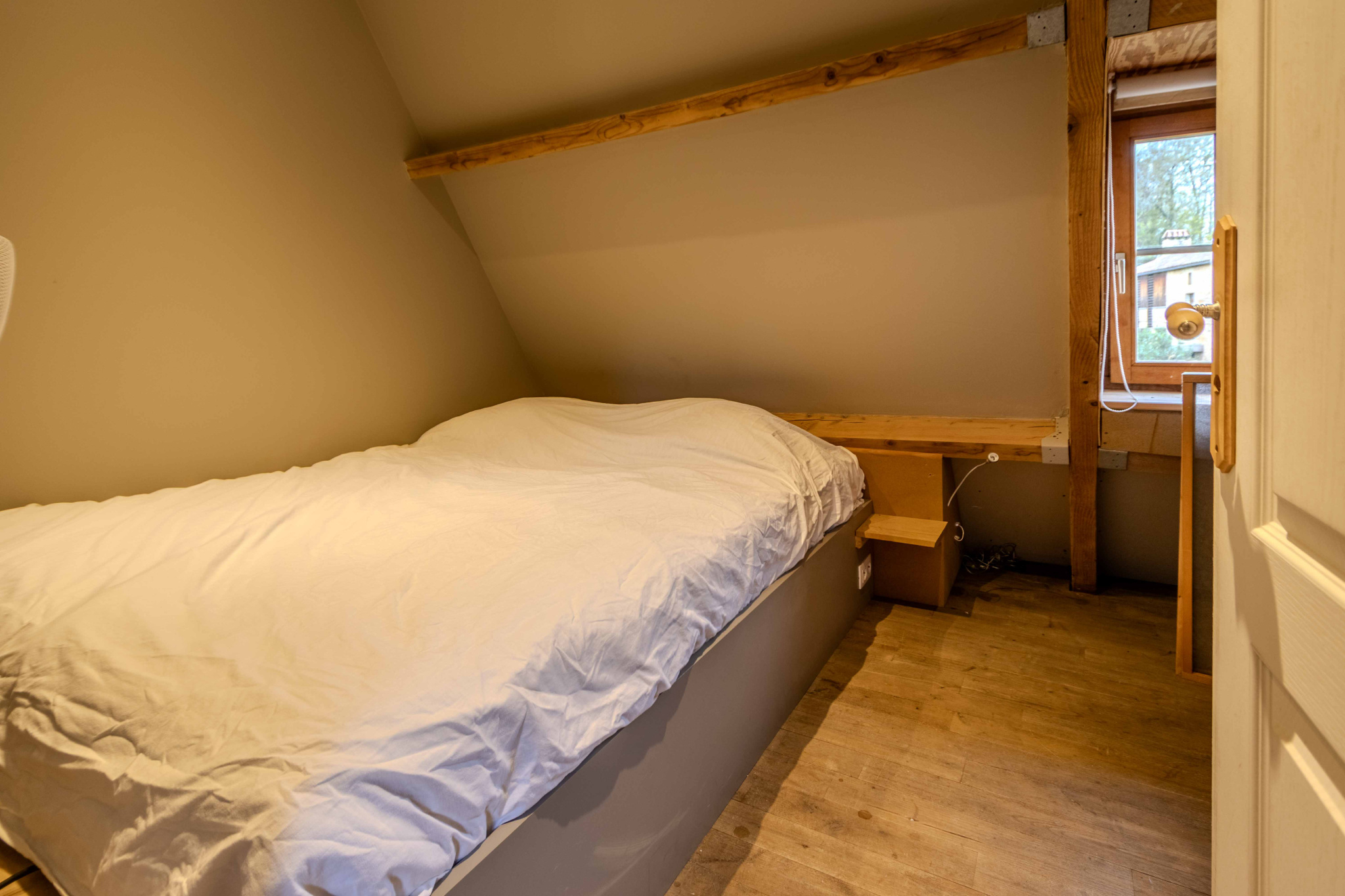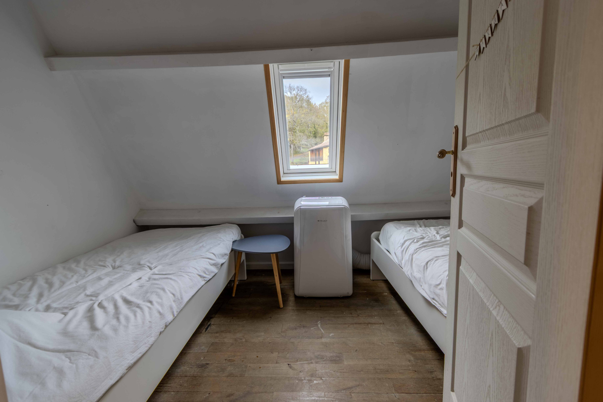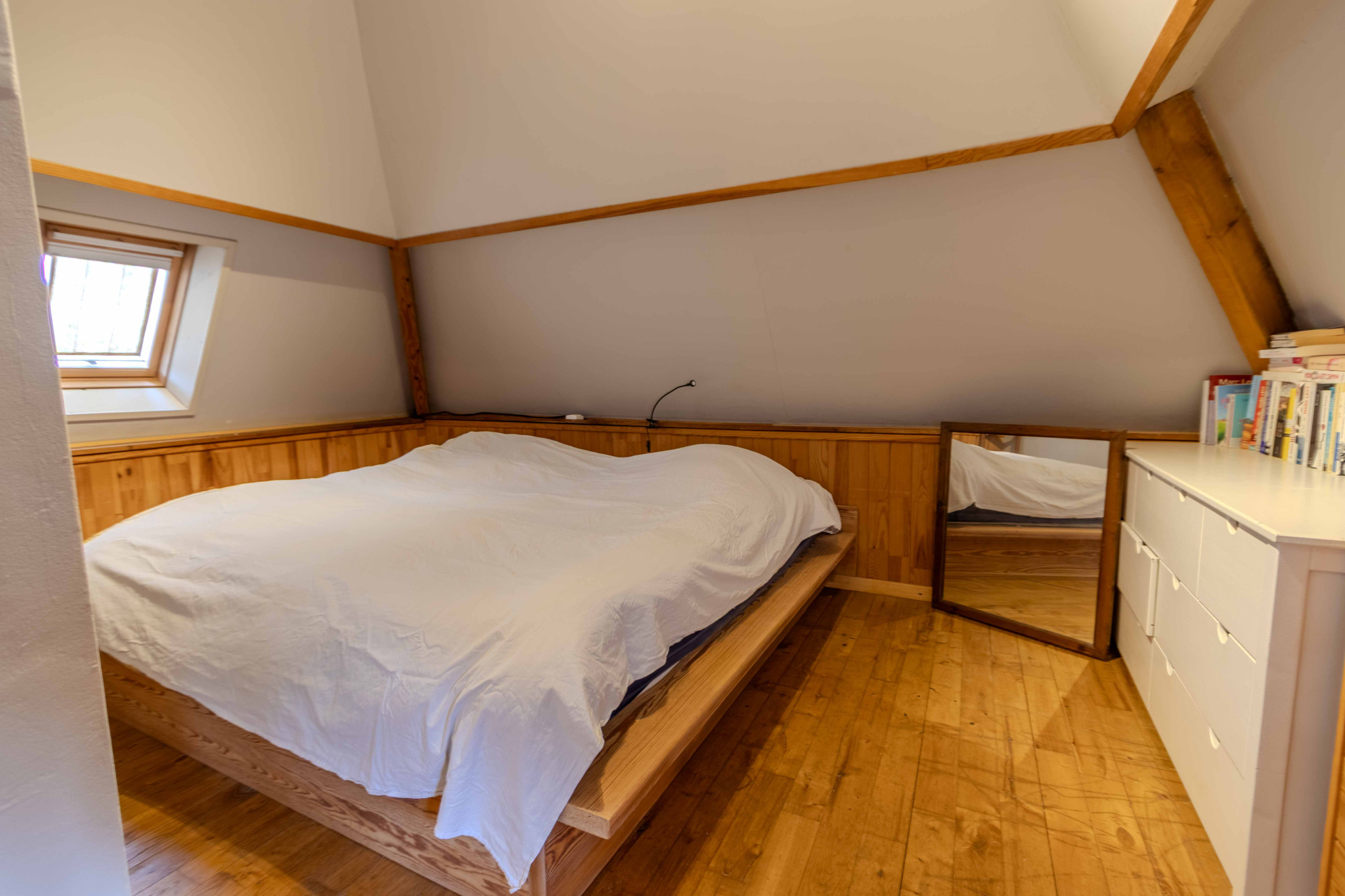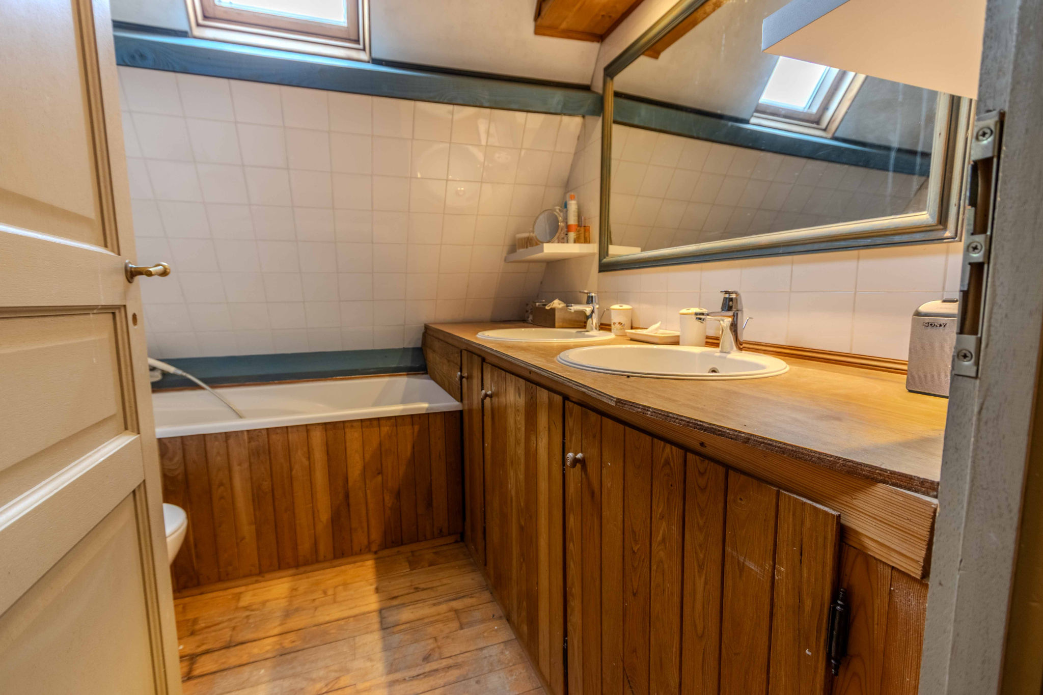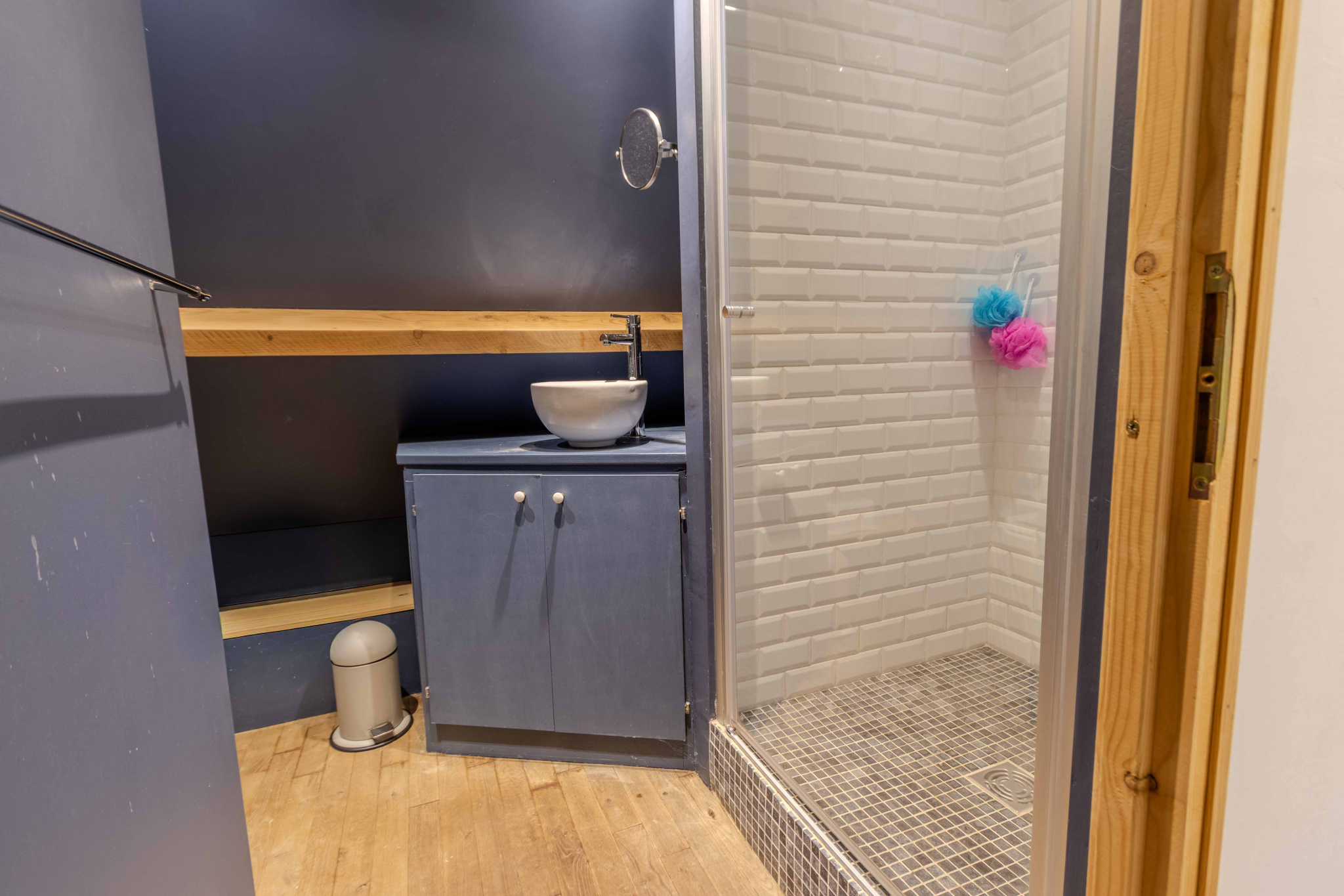 -Pièce de vie avec cheminée ouverte avec poêle à bois.