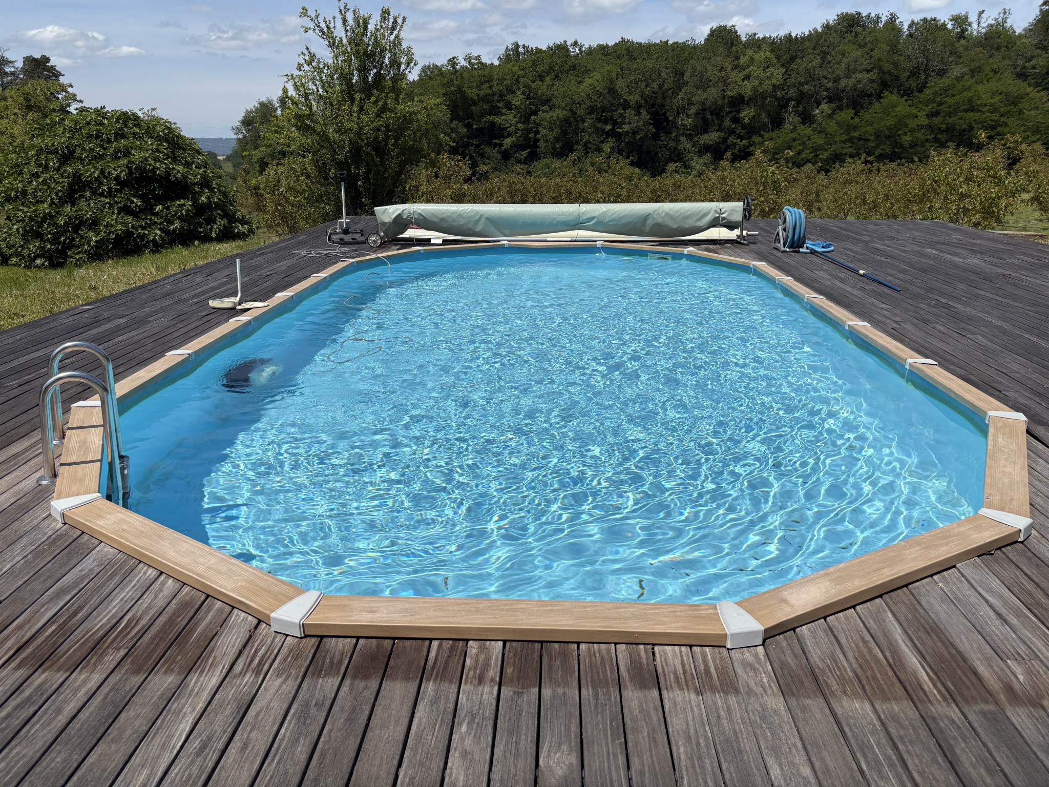 Piscine hors sol, 9,2 x 4,2 m, avec pompe à chaleur au chlore.