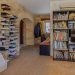 -Salon avec coin bibliothèque et espace rangement ouvrant sur l’extérieur,
