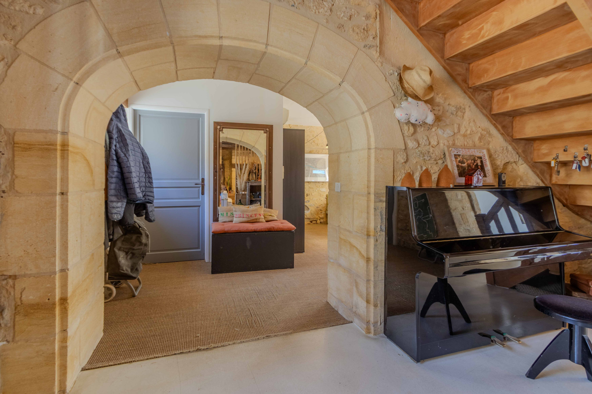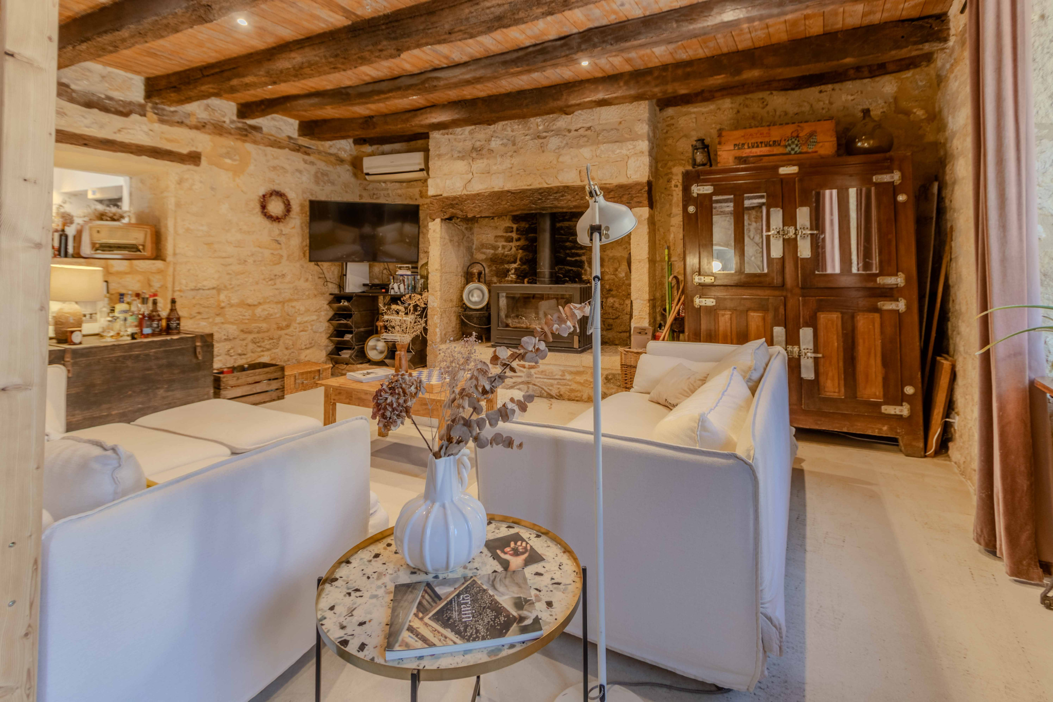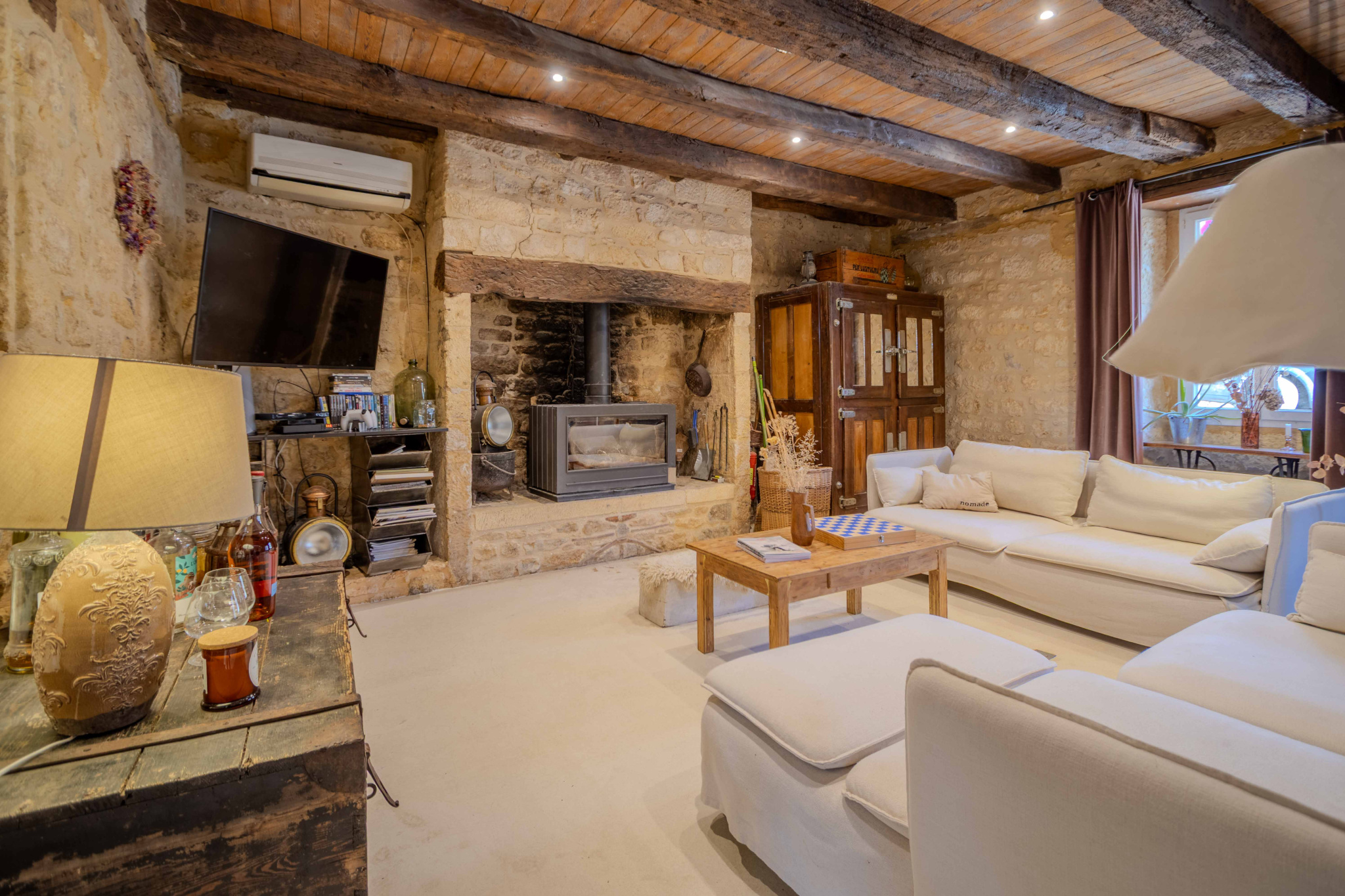 -Entrée sur séjour avec poêle à bois dans ancien cantou, pierres et poutraisons,