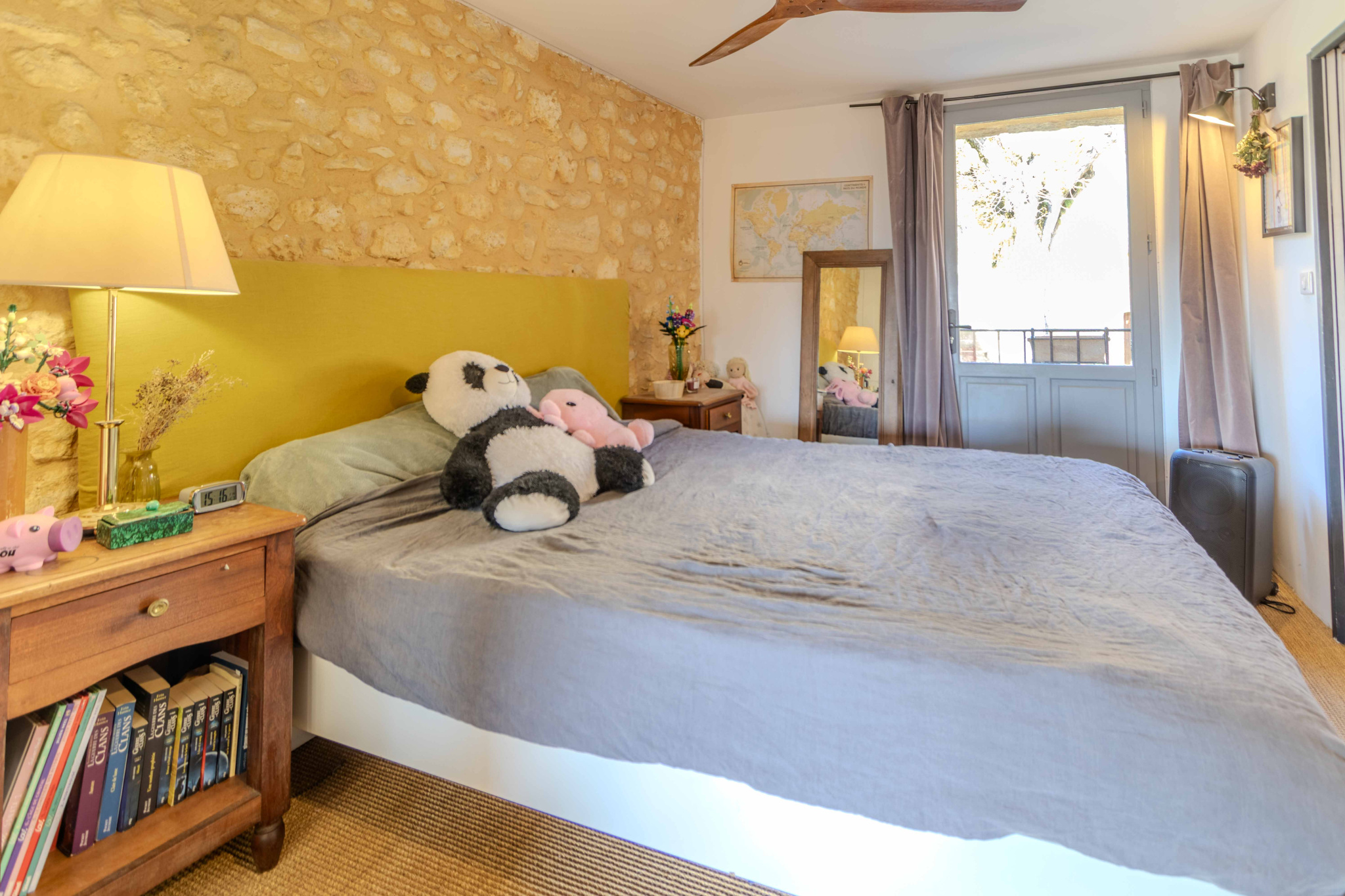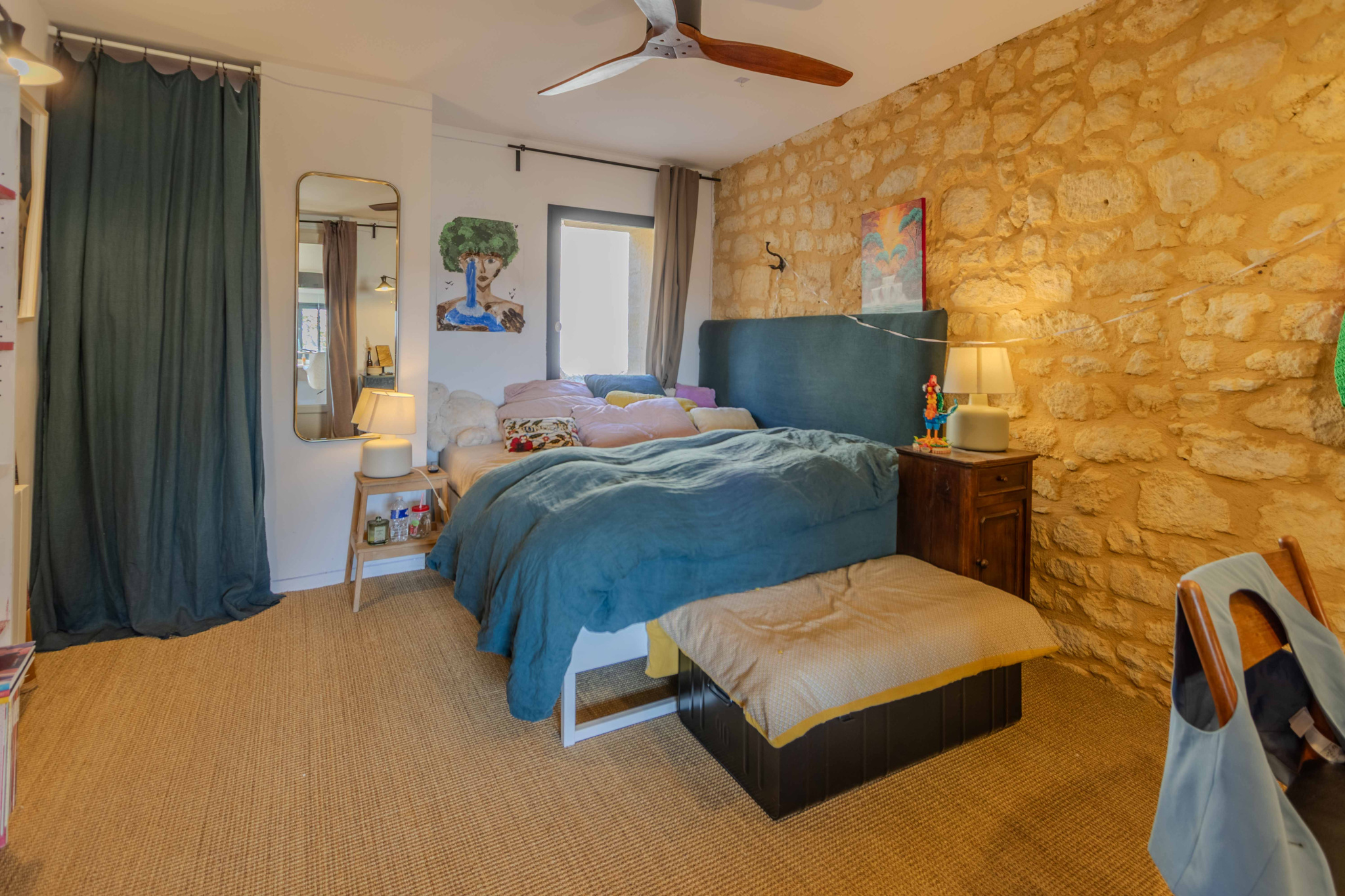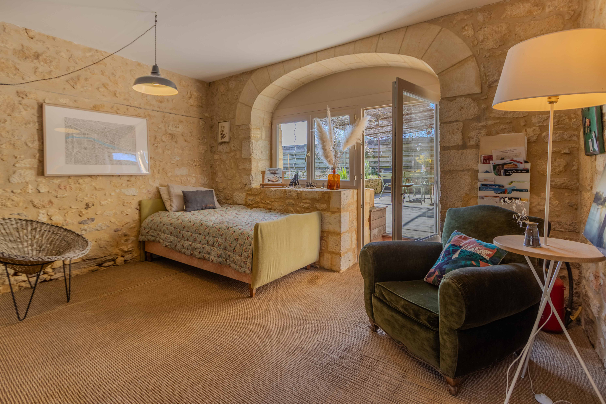 -Entrée sur séjour avec poêle à bois dans ancien cantou, pierres et poutraisons,