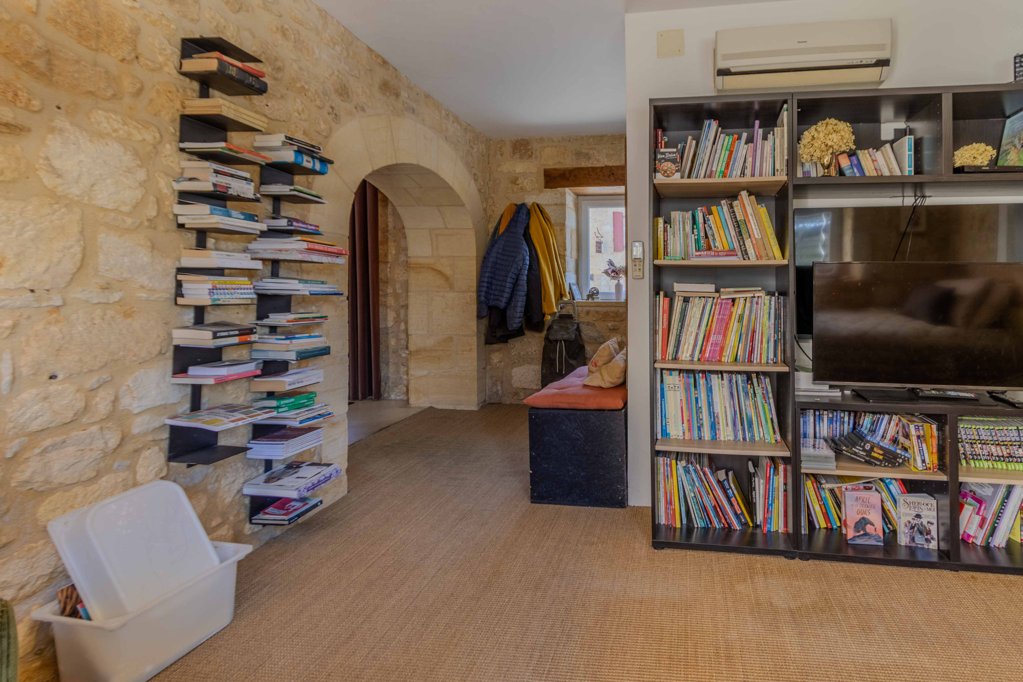 -Salon avec coin bibliothèque et espace rangement ouvrant sur l’extérieur,