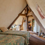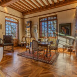 -Grand salon avec parquet à la française, poutraison ouvrant sur terrasse et coursive,