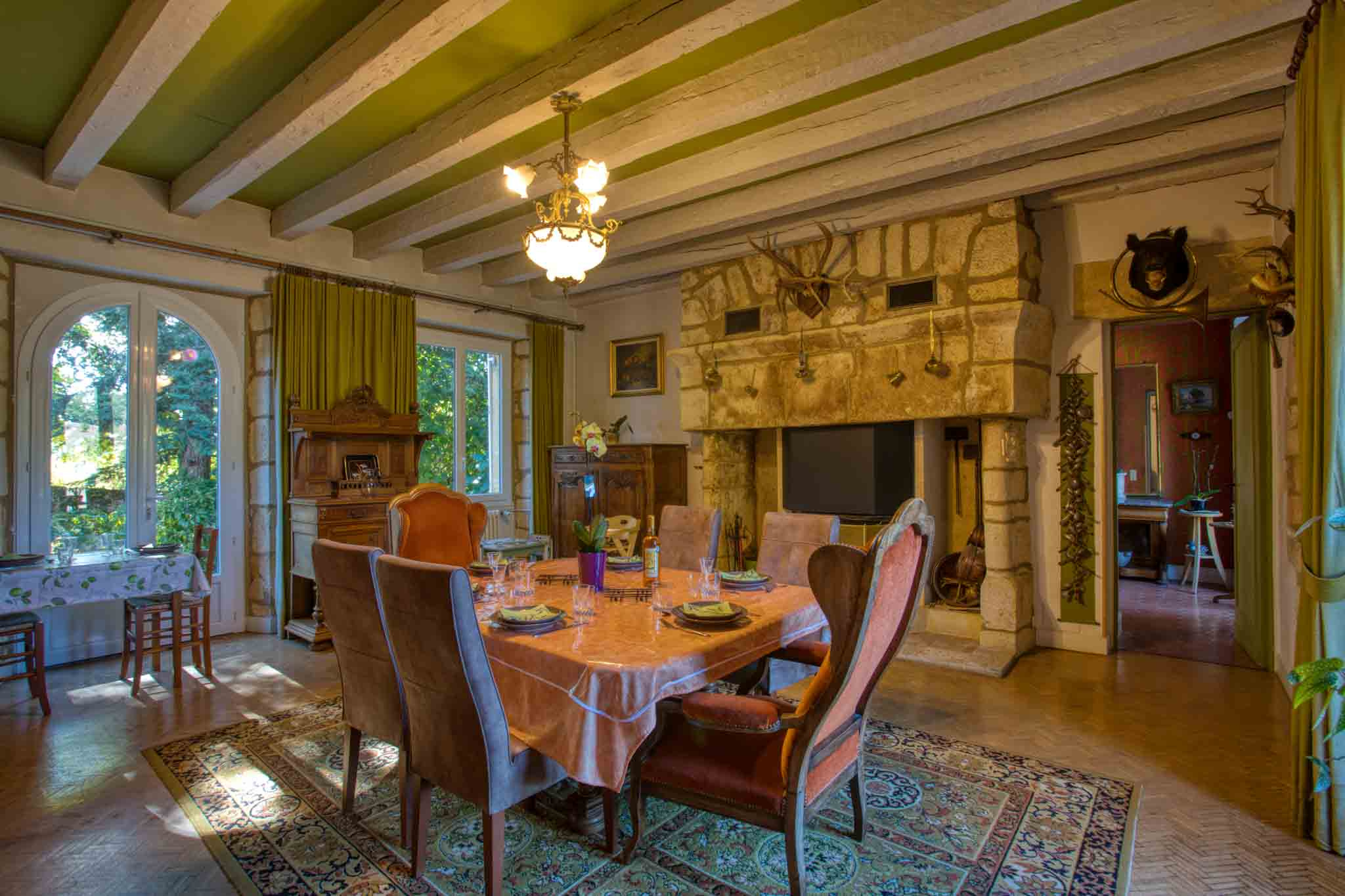 -Séjour avec cheminée équipée d’un insert bois, parquet et placards, ouvrant sur l’extérieur,