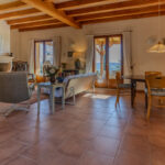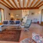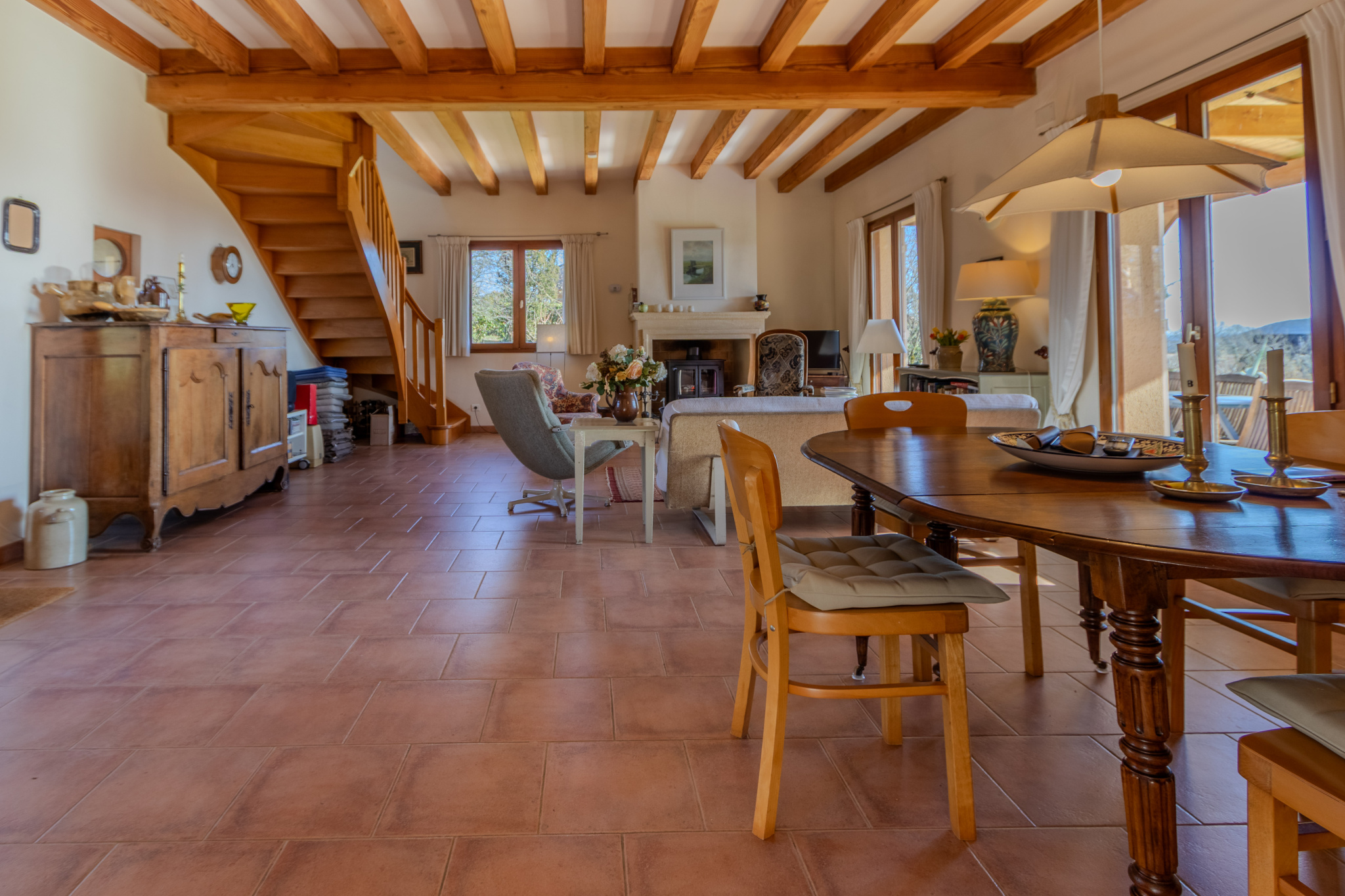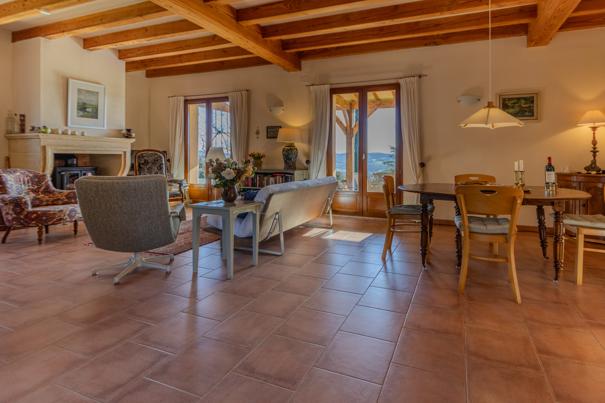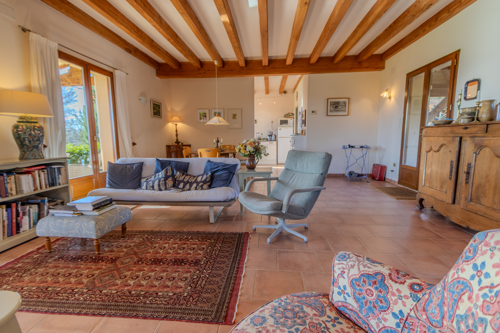 -Séjour salon avec poutraison et poêle à bois ouvrant sur terrasse couverte,