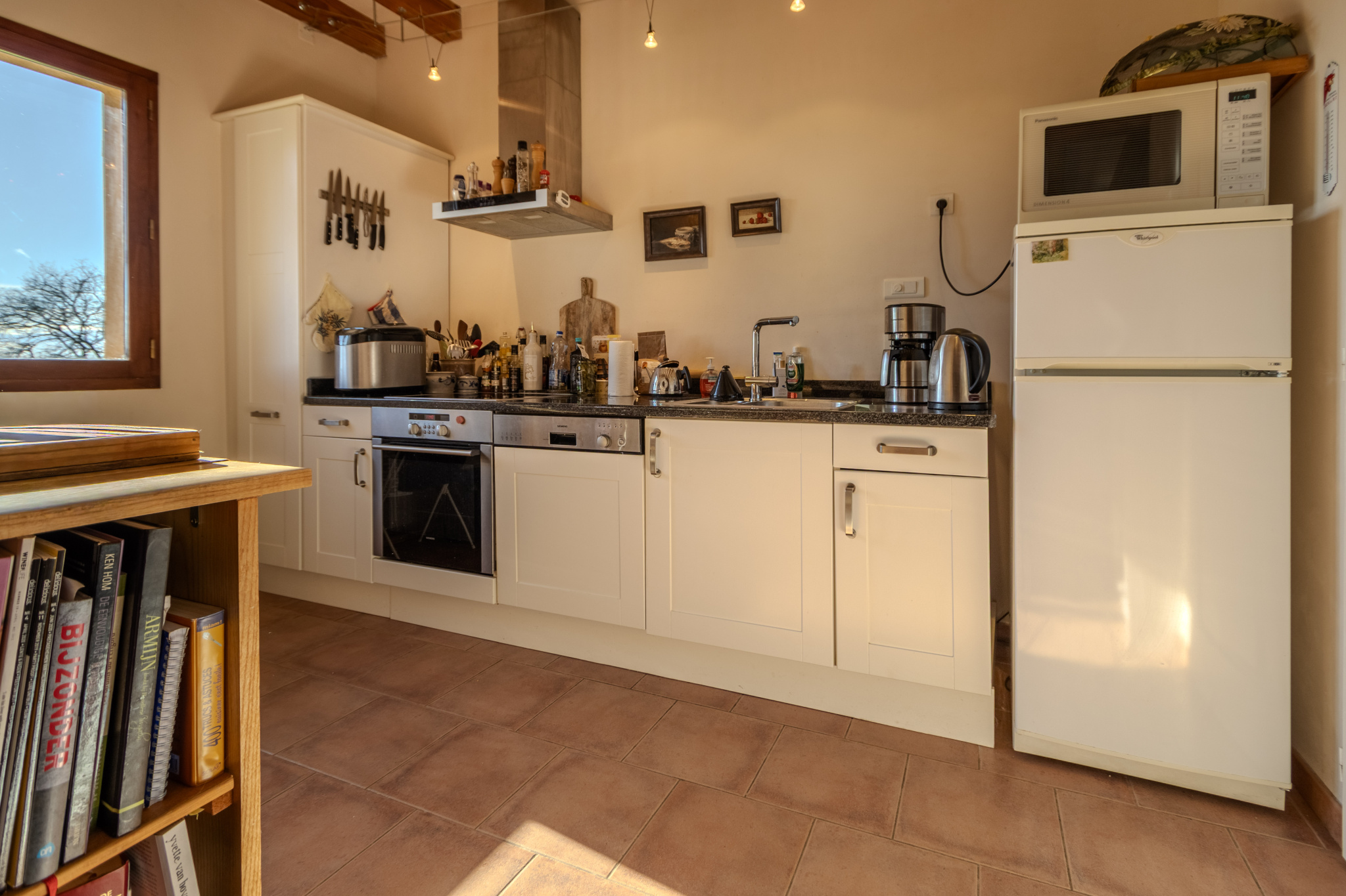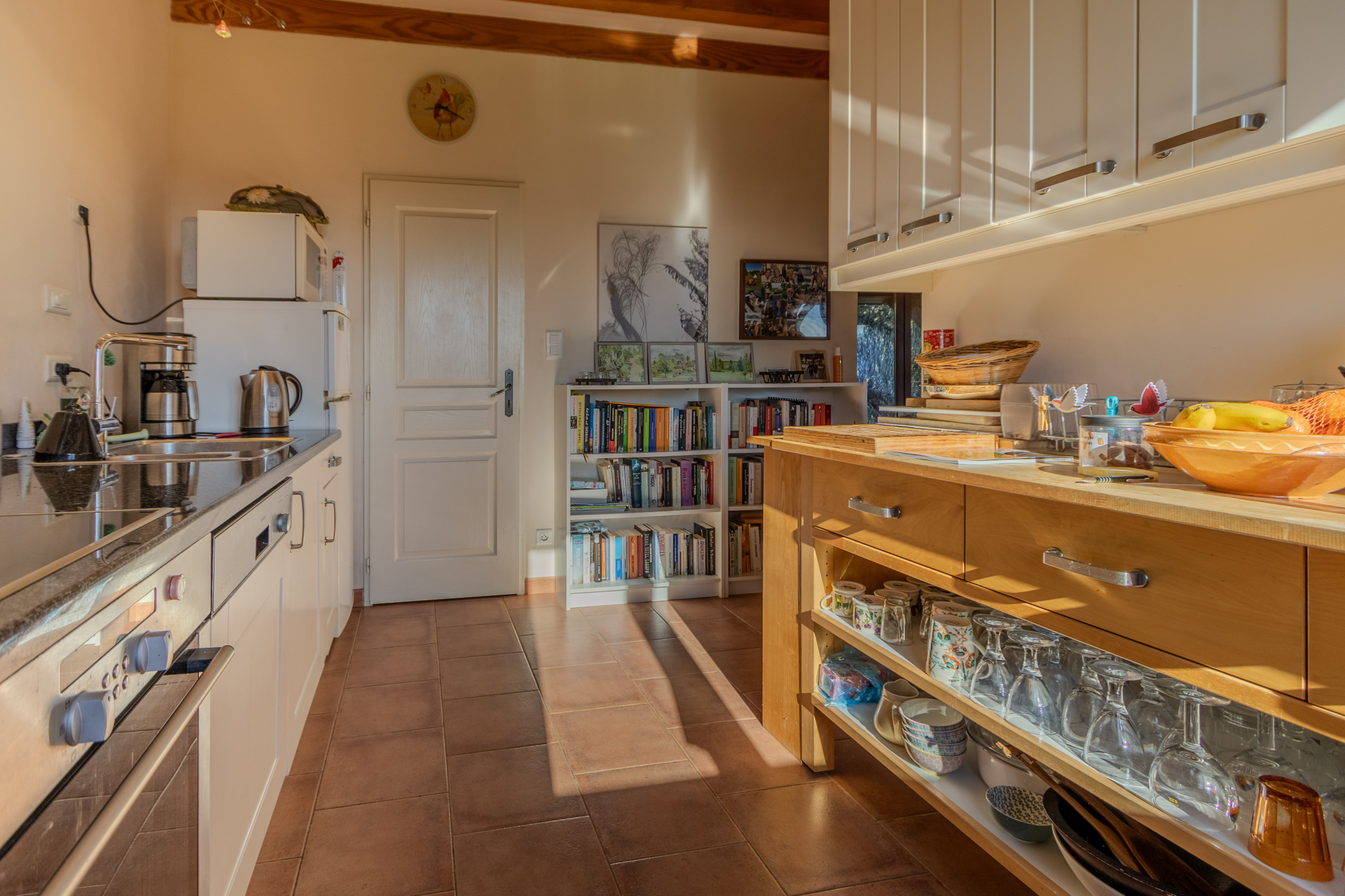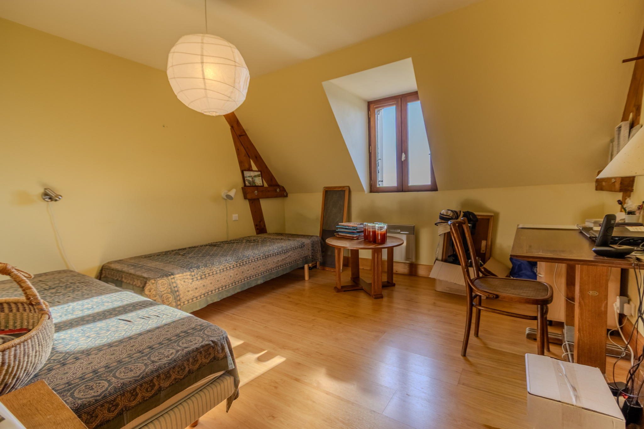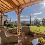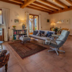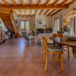 -Séjour salon avec poutraison et poêle à bois ouvrant sur terrasse couverte,