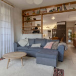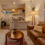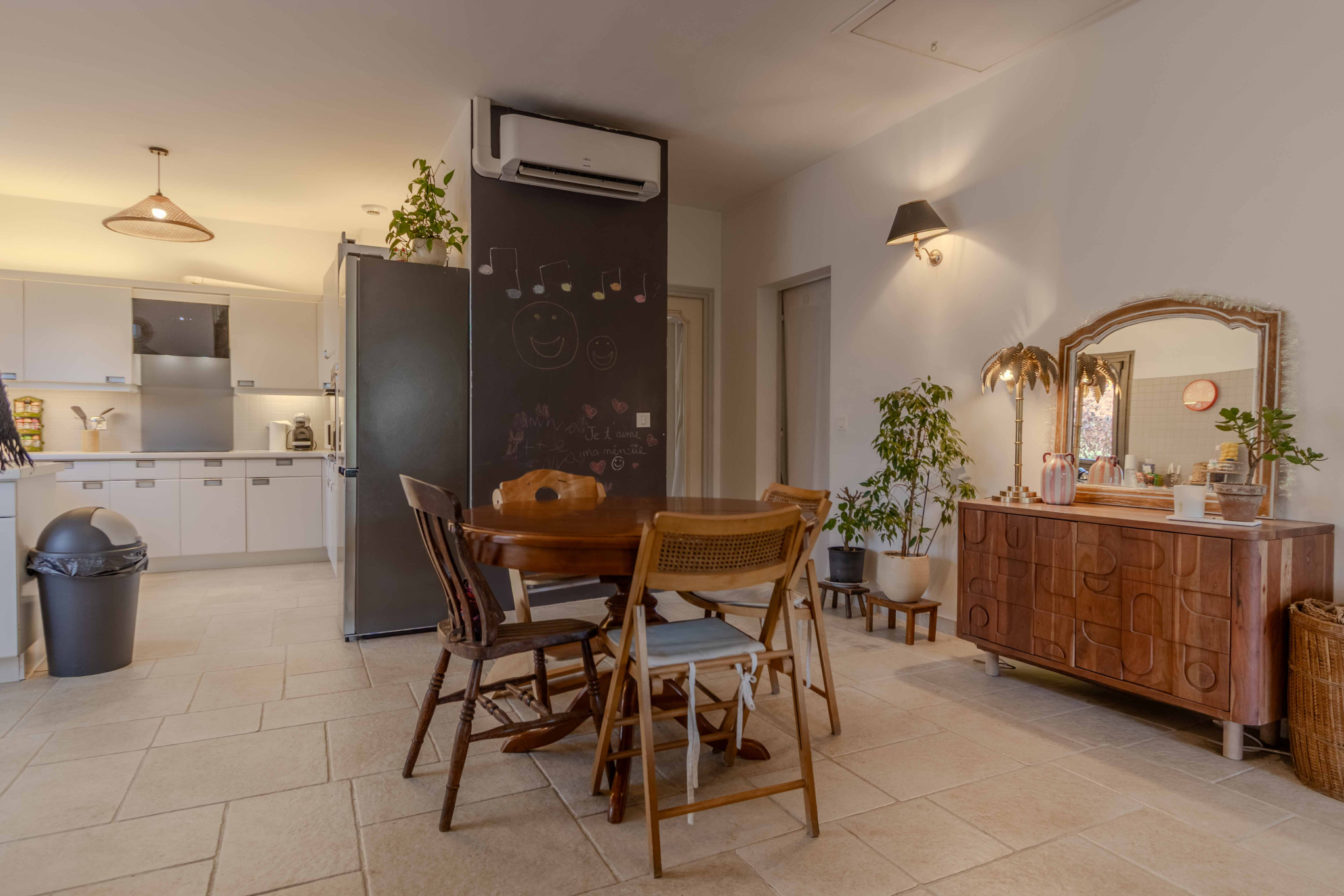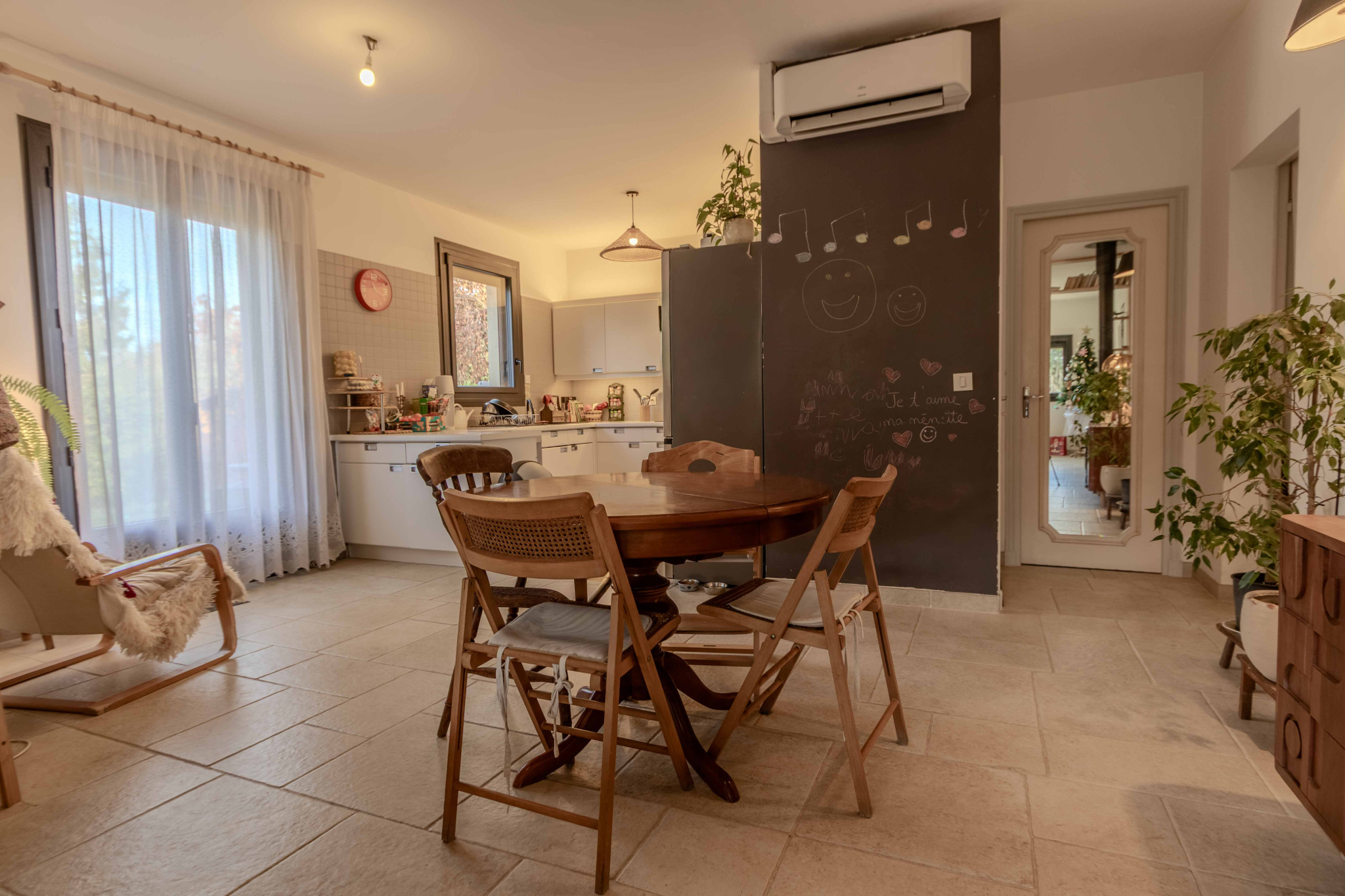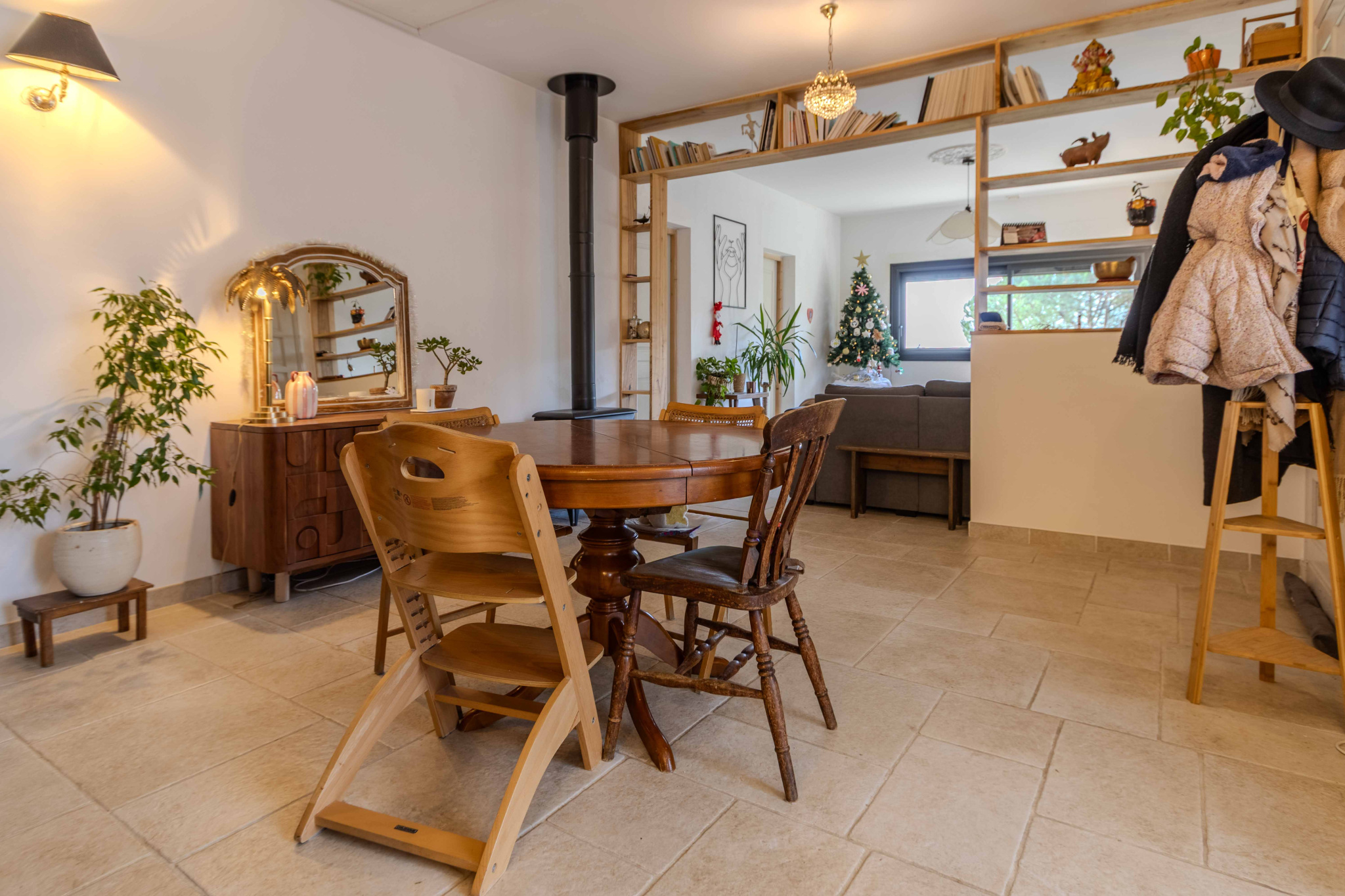 -Séjour salon avec cuisine ouverte, équipée et aménagée avec poêle à bois,
